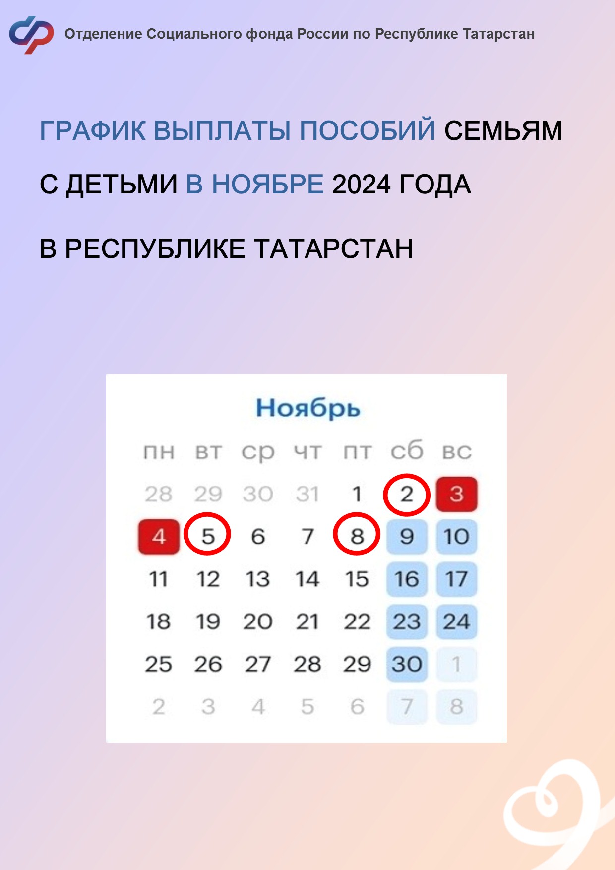 Отделение Социального фонда России по Республике Татарстан сообщает, что в ноябре некоторые даты перечисления детских выплат попадают на выходные дни, в связи, с чем график перечисления денежных средств скорректирован. Итак: