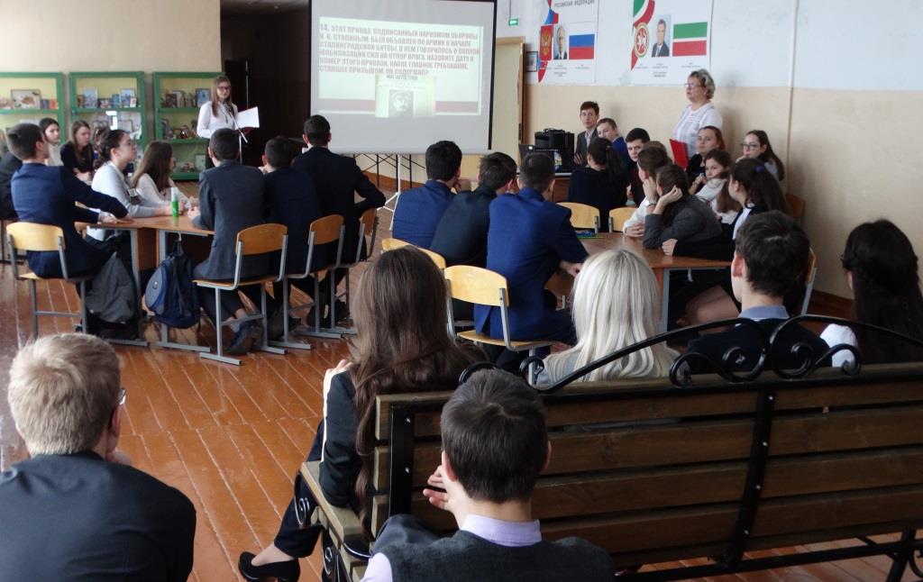 В МБОУ «Тетюшская СОШ №2» в рамках декады, посвященной 75-летию со дня окончания Сталинградской битвы, учитель истории и обществознания Елена Юрьевна Юдина и учащиеся 11 класса провели брейн-ринг «Сталинград – символ победы и мужества» среди учащихся 9 и 10 классов, поделенных на три команды. В ходе мероприятия ребята отвечали на тематические вопросы, подготовили творческое задание «Сталинградская битва моими глазами». Победу одержала команда учащихся 9А класса с символическим названием «Победа».