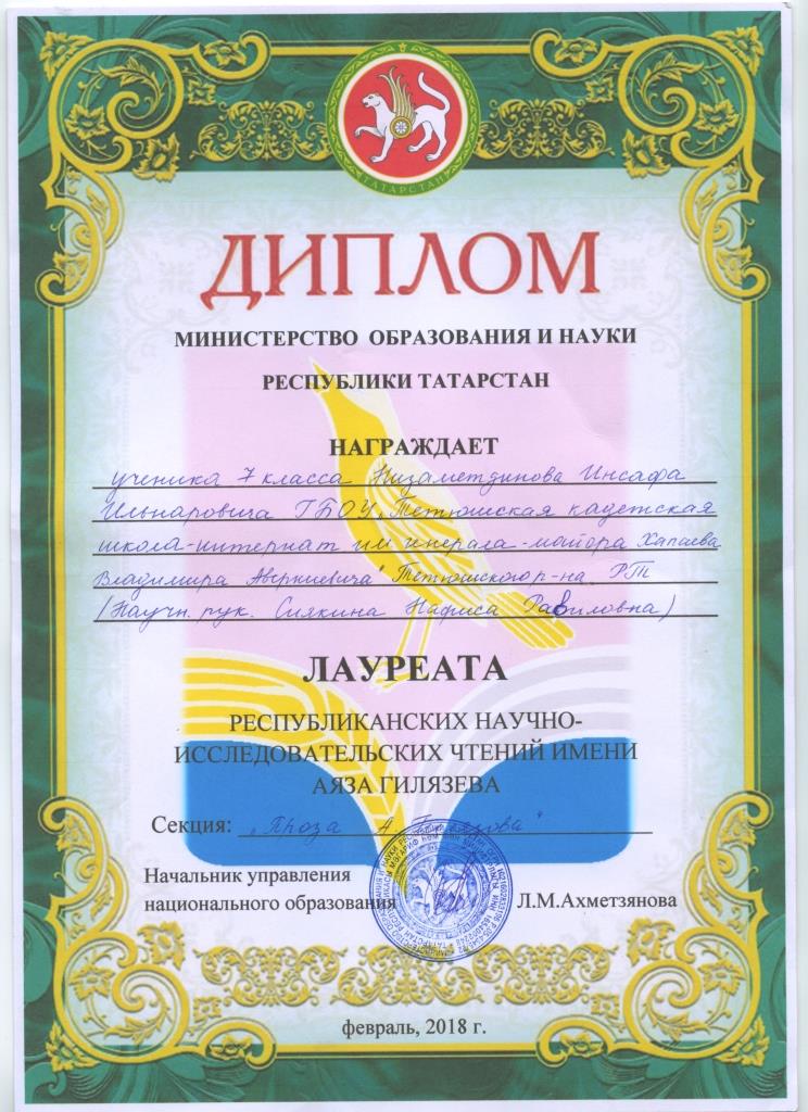 В селе Сарманово прошли Республиканские научно-исследовательские чтения, посвященные 90-летию татарского народного писателя и драматурга Аяза Гилязова. В номинации “Проза А. Гилязова” принял участие воспитанник 7 класса Низамутдинов Инсаф. Эти чтения стали для Инсафа первым конкурсом республиканского уровня. Наш воспитанник стал Лауреатом конкурса и был награжден Дипломом Министерства образования и науки РТ (руководитель – учитель татарского языка и литературы Сиякина Н.Р.).