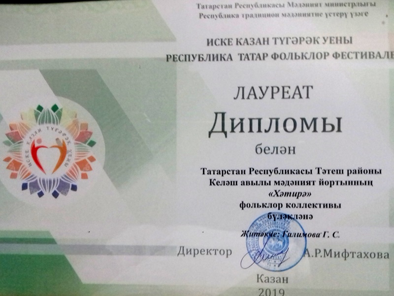 Фольклорный коллектив "Хатира", действующий при Кляшевском доме культуры, принял участие в Республиканском фестивале "Иске Казан түгәрәк уены". Самодеятельные артисты показали ритуал сбора майских трав "Май уны" и удостоены Диплома лауреата фестиваля. Члены коллектива благодарны Риме Гумеровне Сафиулловой за оказанную спонсорскую помощь.