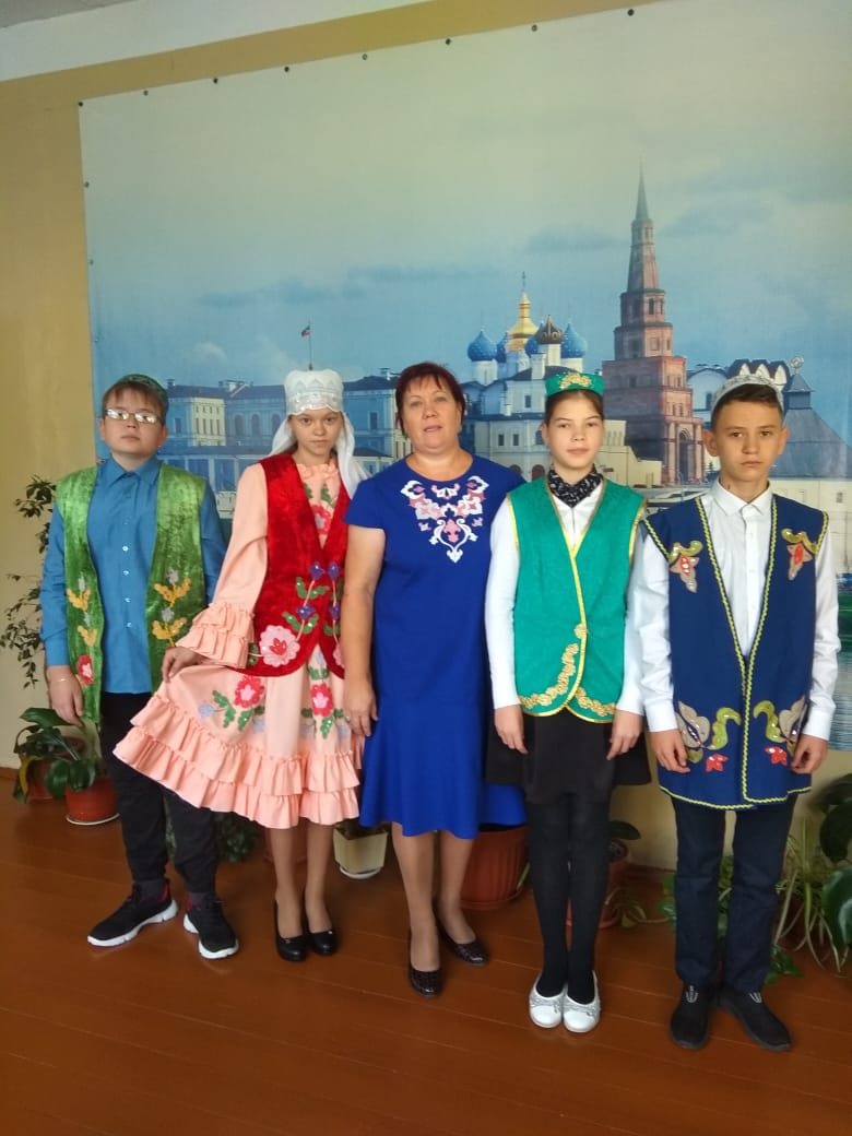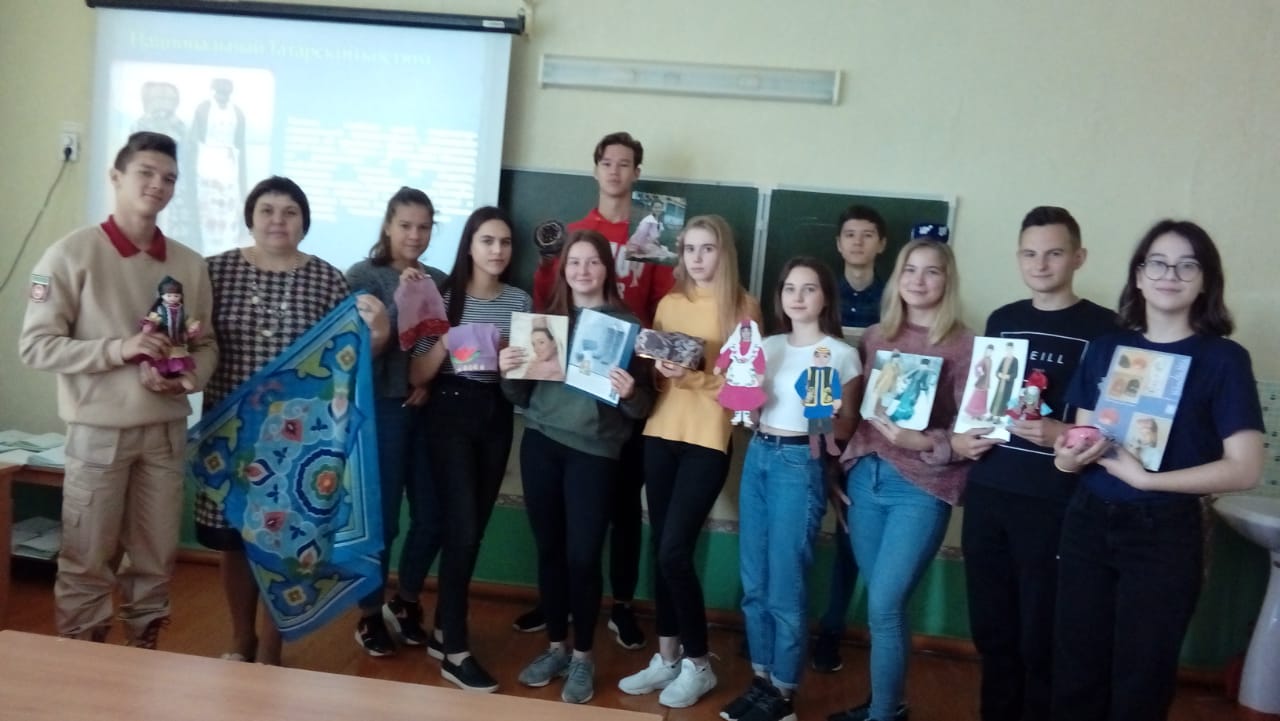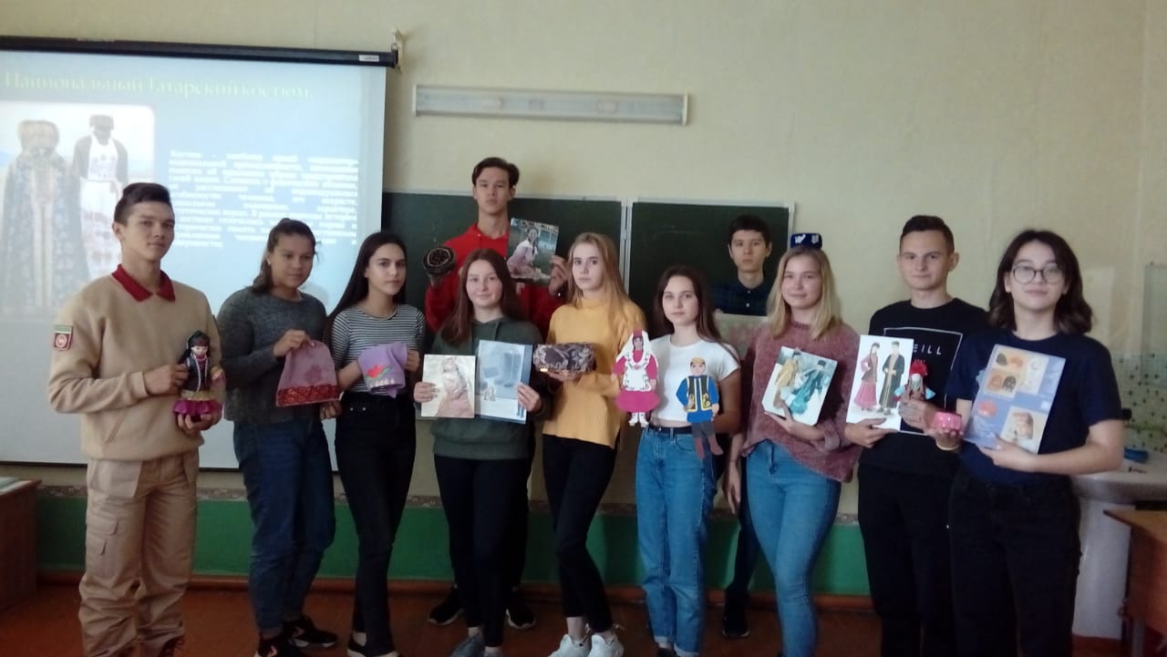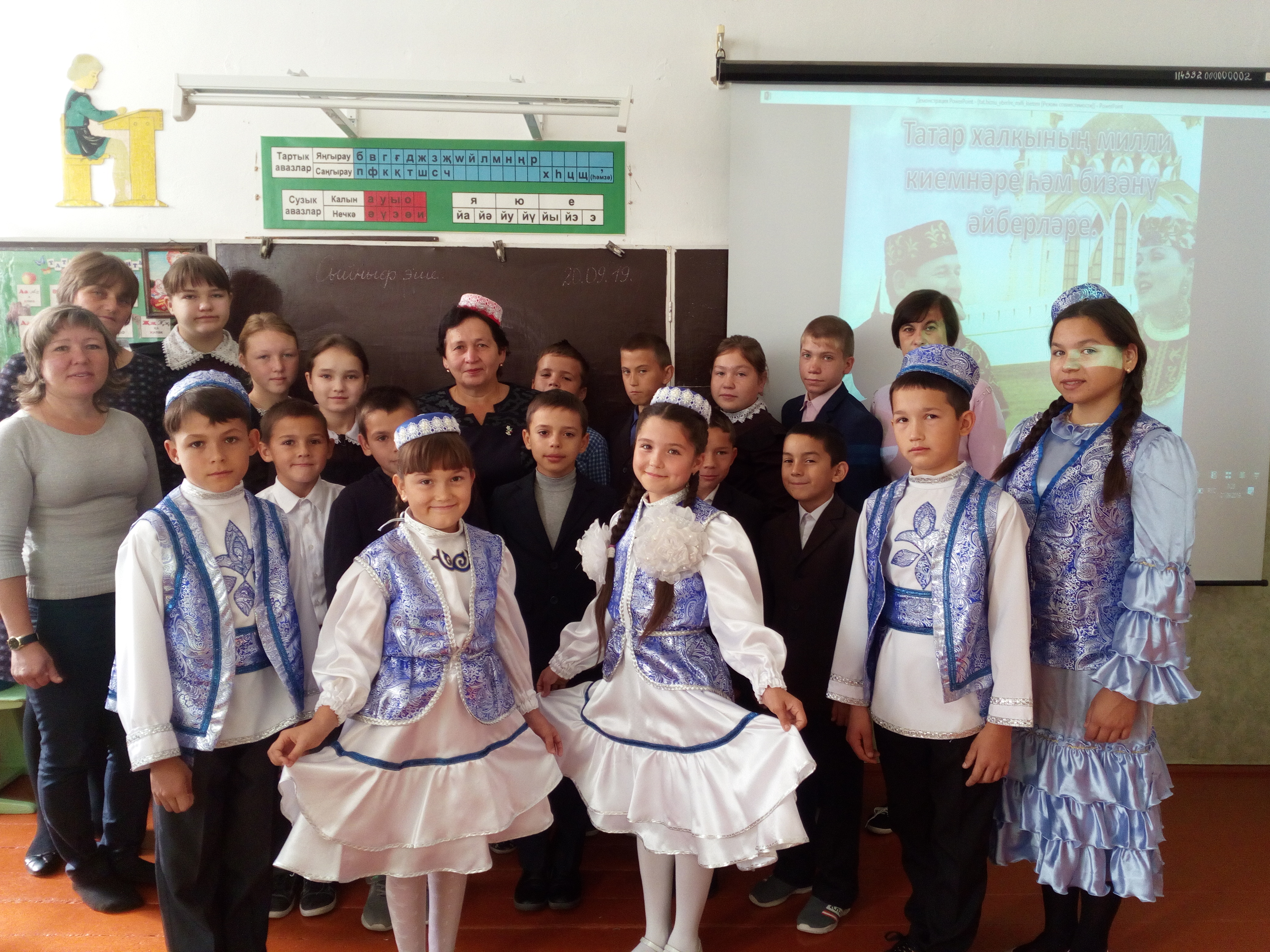 В 11классе (учитель Нафигина Г.А.) МБОУ «Тетюшская СОШ№2» прошло мероприятие, посвященное этой дате - «Татарский костюм - яркость цветов и украшений». В рамках мероприятия учащиеся познакомились с особенностями элементов одежды татарского народа, с историей костюма. Классический традиционный комплекс татарского народного костюма складывается с середины 18 века, но его характерный, дошедший до нас облик относится к поздним временам- 19-20 векам. Мероприятие завершилось мастер-классом по изготовлению татарского национального головного убора – калфака.