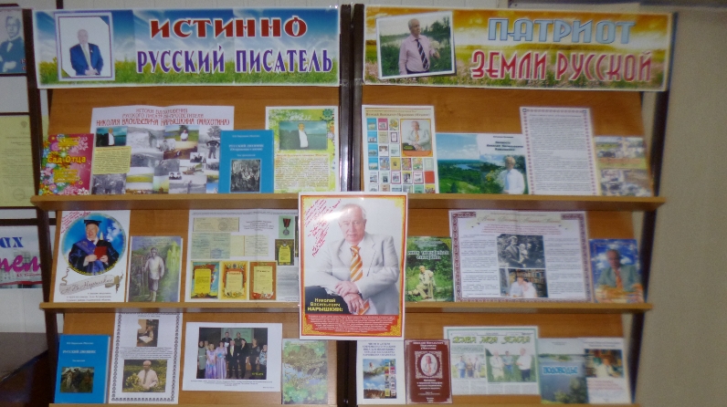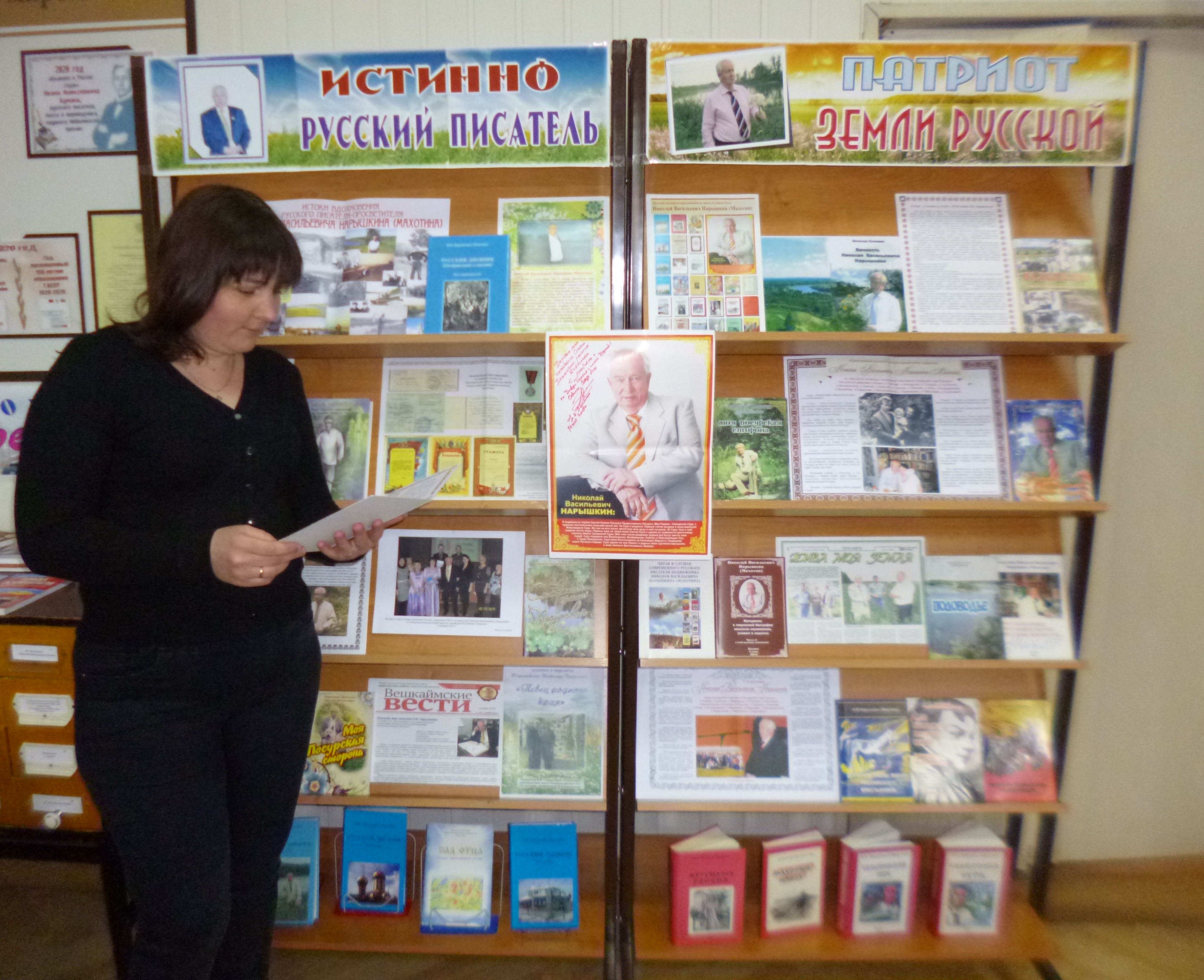 В Центральной библиотеке действует книжно – иллюстративная выставка «Патриот земли русской», посвященная творчеству Николая Васильевича Нарышкина - русскому писателю, ученому, общественному деятелю, академику, члену Союза писателей России, Почётному гражданину Карсунского района. Щедро дарит нам Николай Васильевич свет души своей, который тёплым лучом проникает со страниц его произведений в сердца и души читателей. В его книгах встаёт мир, воспетый человеком с удивительно щедрым сердцем.