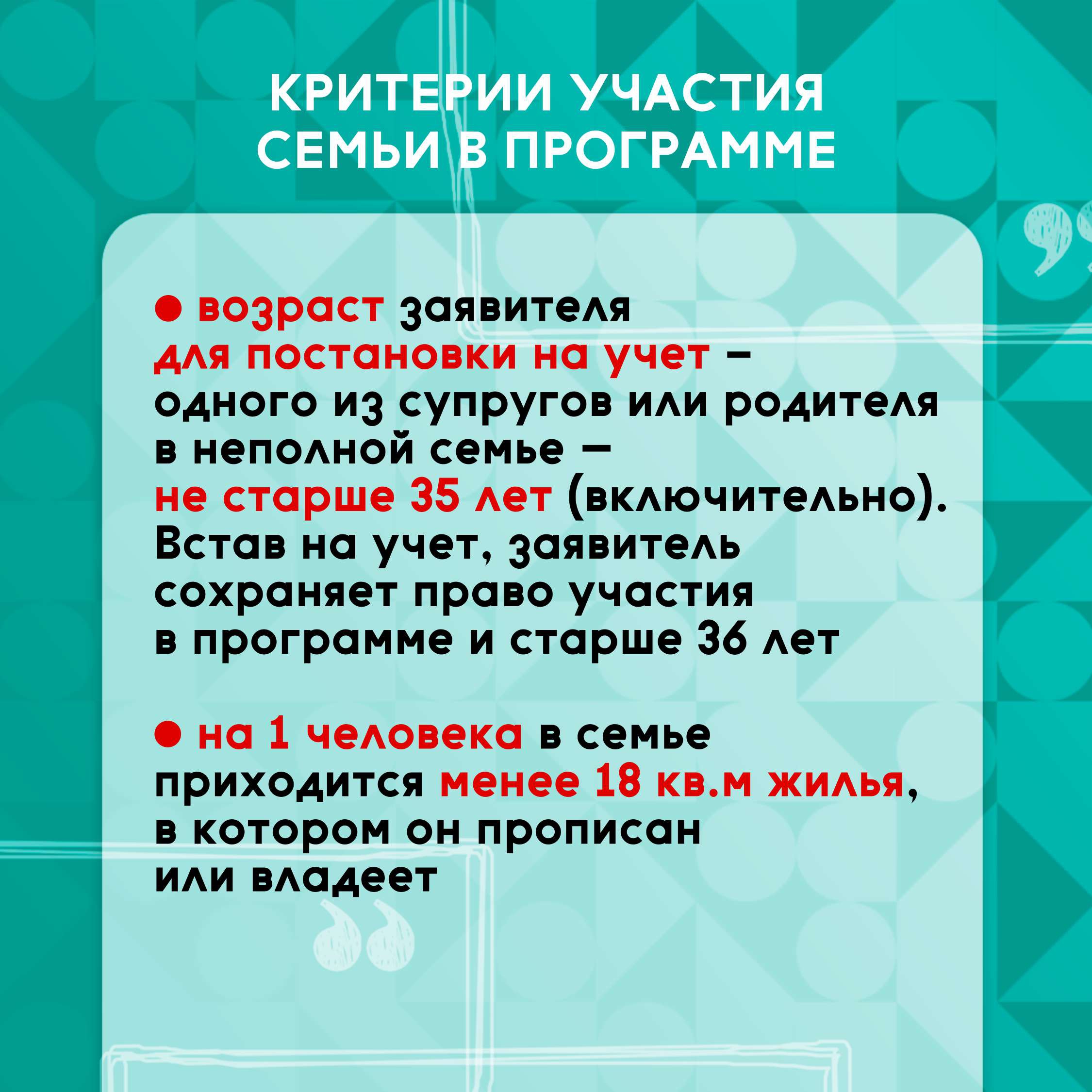 – возраст заявителя для постановки на учет - одного из супругов или родителя в неполной семье – не старше 35 лет (включительно). Встав на учет, заявитель сохраняет право участия в программе и после достижения 36 лет