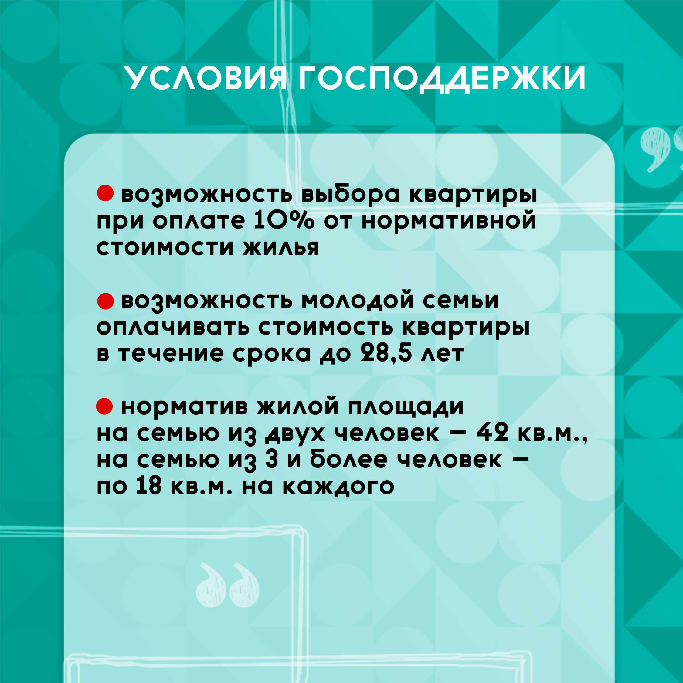 – норматив жилой площади на семью из двух человек – 42 кв.м, на семью из 3 и более человек – по 18 кв.м на каждого;