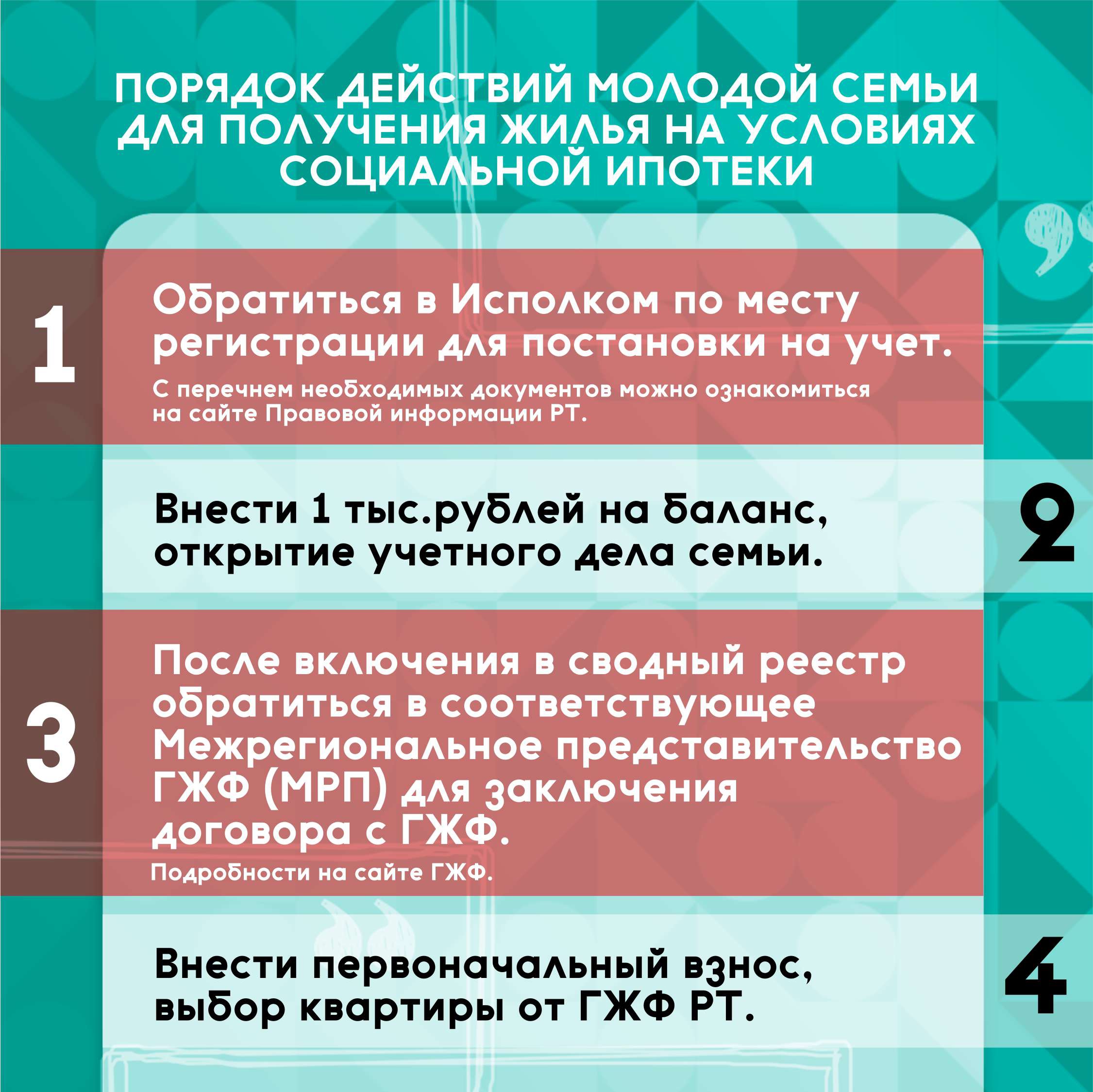 4. внесение первоначального взноса, при внесении от 10% и более от стоимости жилья – выбор квартиры от ГЖФ РТ;