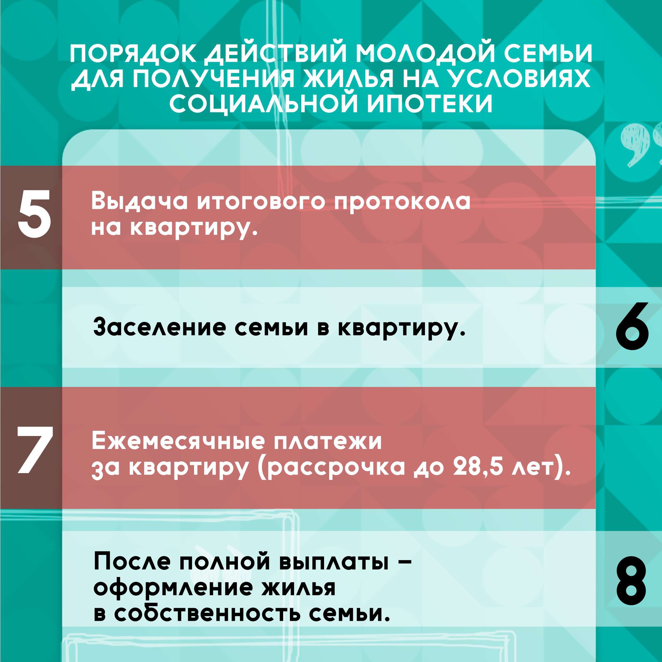 8. после полной выплаты - оформление жилья в собственность семьи.