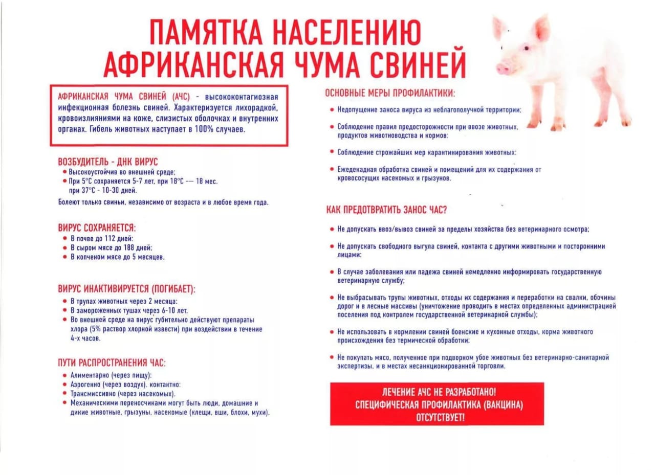 Возбудителем АЧС является вирус, крайне устойчивый к физическому и химическому воздействию, сохраняется в продуктах свиного происхождения, не подвергнутых термической обработке. Между заражением и проявлением клинических признаков может пройти от 2 до 22 суток. При остром течении болезни возможна внезапная гибель животных либо их гибель в течение 1-3 дней после появления первых признаков болезни: повышенная температура тела (41–42 градусов), учащенное дыхание и покраснение кожи. На различных участках кожных покровов животных могут появиться фиолетово-красные пятна, не бледнеющие при надавливании. Средств для лечения и профилактики болезни не существует! Гибель может достигать 100 %!