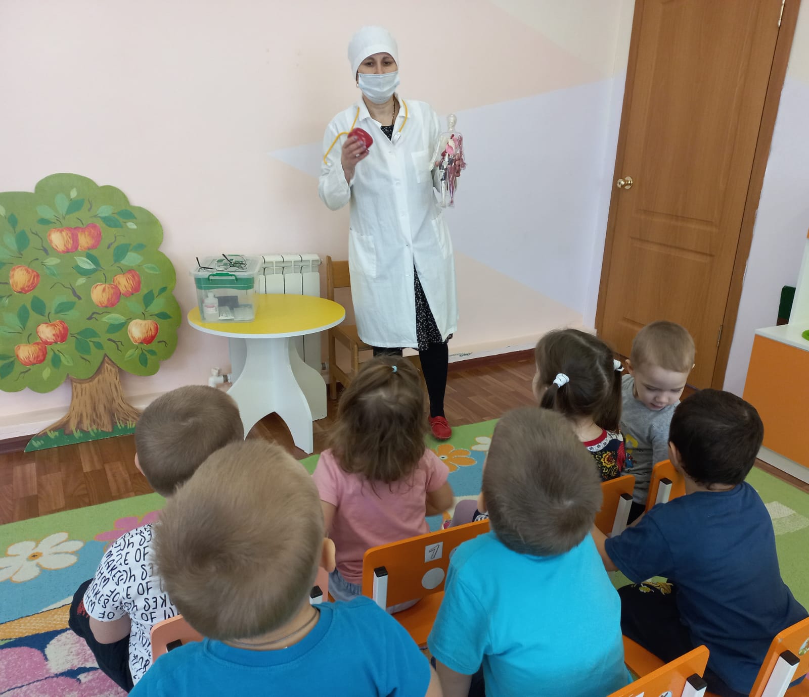 Рассматривали иллюстрации, фотографии о здоровье. Конструировали "Дворец спорта". Ежедневно с детьми проводились беседы: "Витамины растут на грядке", "Чистота залог здоровья", "Откуда берутся болезни". В первой младшей группе была проведена физкультурно-оздоровительная деятельность "Личная гигиена", во второй младшей группе "Путешествие яблока", "День здоровья для Бабы - Яги", в старшей группе "День мяча", была организована выставка детских рисунков "Со спортом дружить - здоровыми быть", в подготовительной группе спортивный досуг "Физкульт-ура!", в татарской разновозрастной было проведено спортивное развлечение "Весенний лучик здоровья".