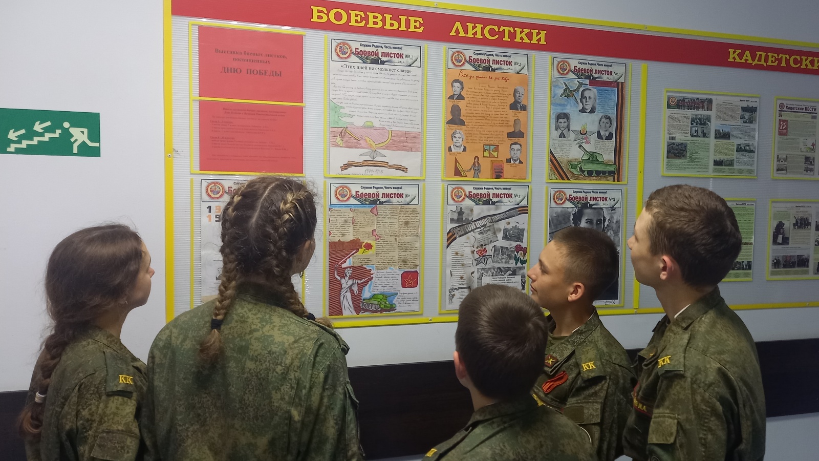 Кадеты 5-ого класса изготовили боевой листок на тему «Этих дней не смолкнет слава»; 6-ой и 8-ой классы представили тему «Всё для фронта, всё для Победы!»; 7-ой класс подготовили боевой листок: «Пионеры – герои Великой Отечественной войны»; 9-ый класс осветил тему «Города-герои Великой Отечественной войны»; 10-ый класс напомнили нам «Какой ценой далась Победа» и 11-ый класс представил тему «У войны не женское лицо».
