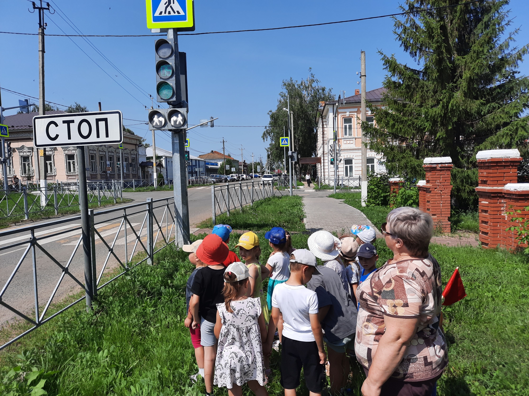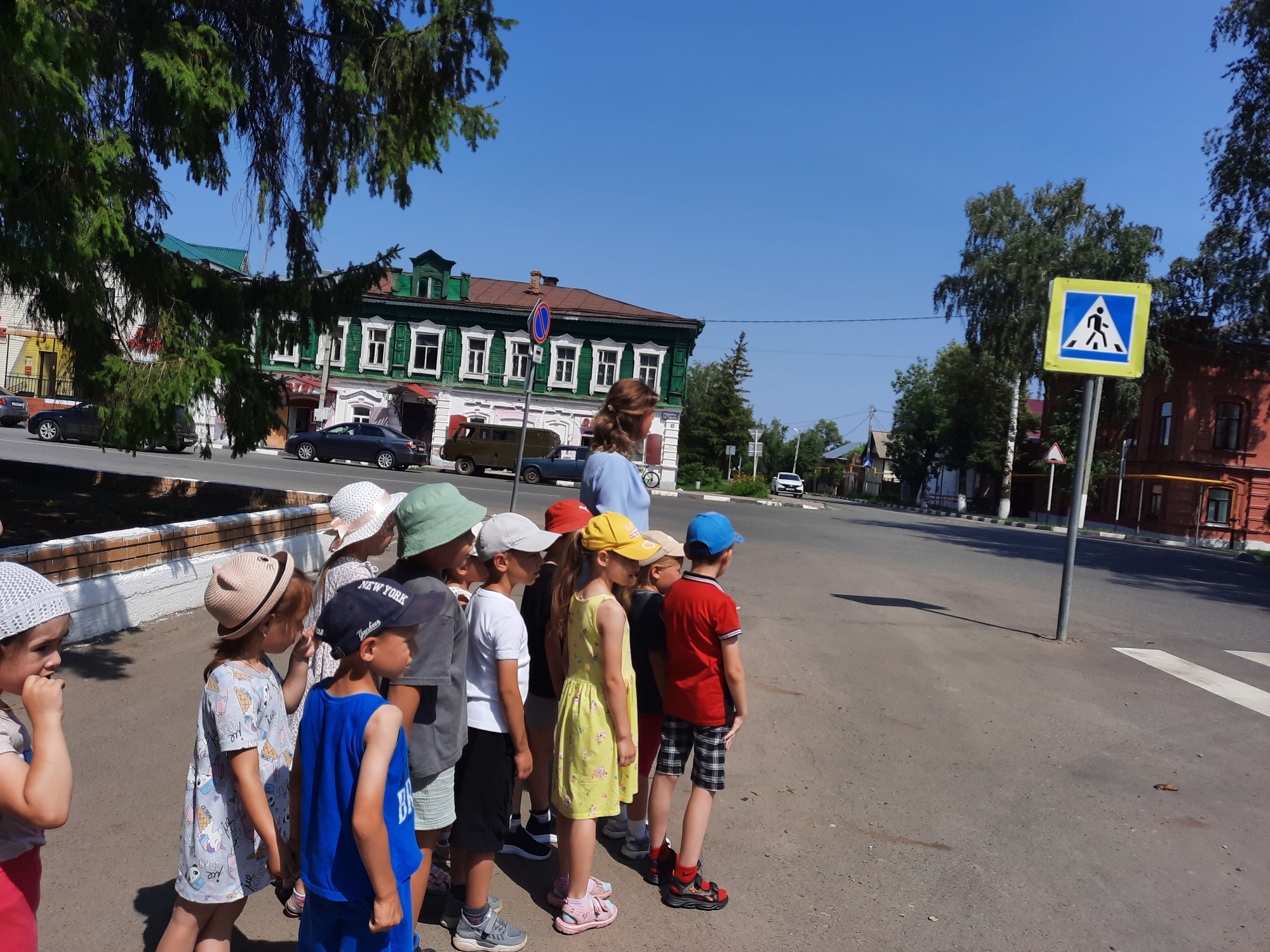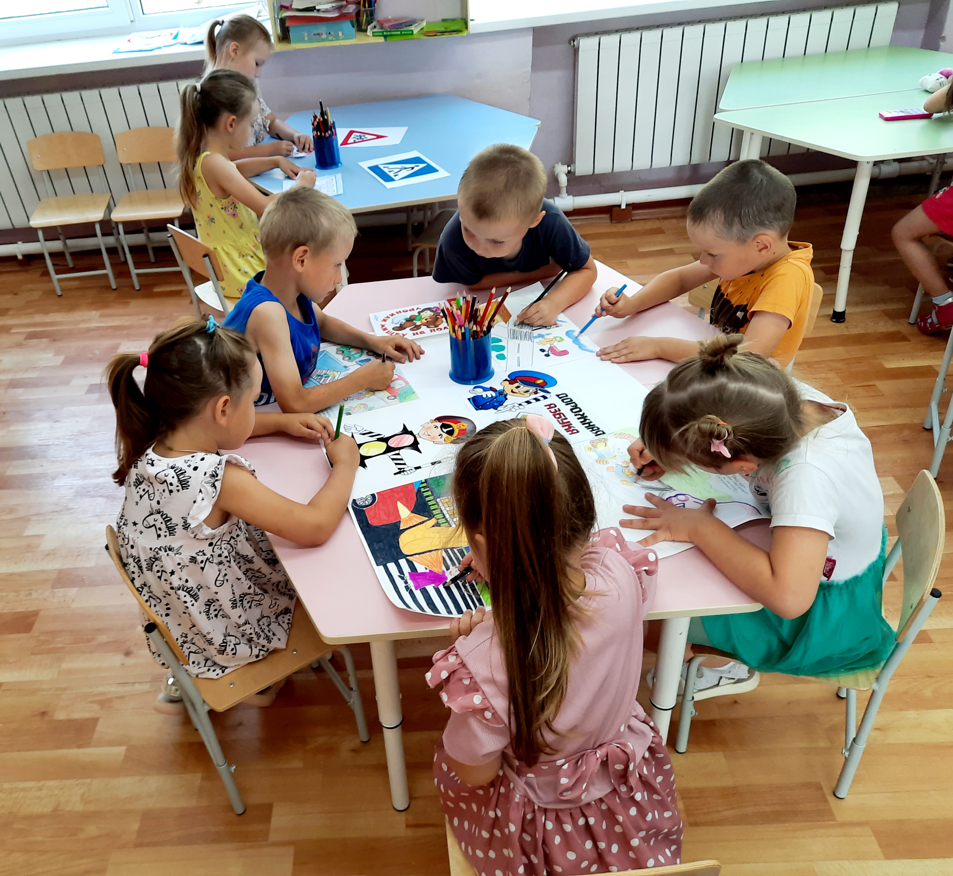 С детьми проводились беседы: «Светофор-наш друг», «Устройство проезжей части». Ребята приняли активное участие в коллективной работе по изготовлению плаката «Азбука пешехода». Так же была проведена целевая прогулка по улицам города, где ребята наблюдали за транспортом и пешеходным переходом.