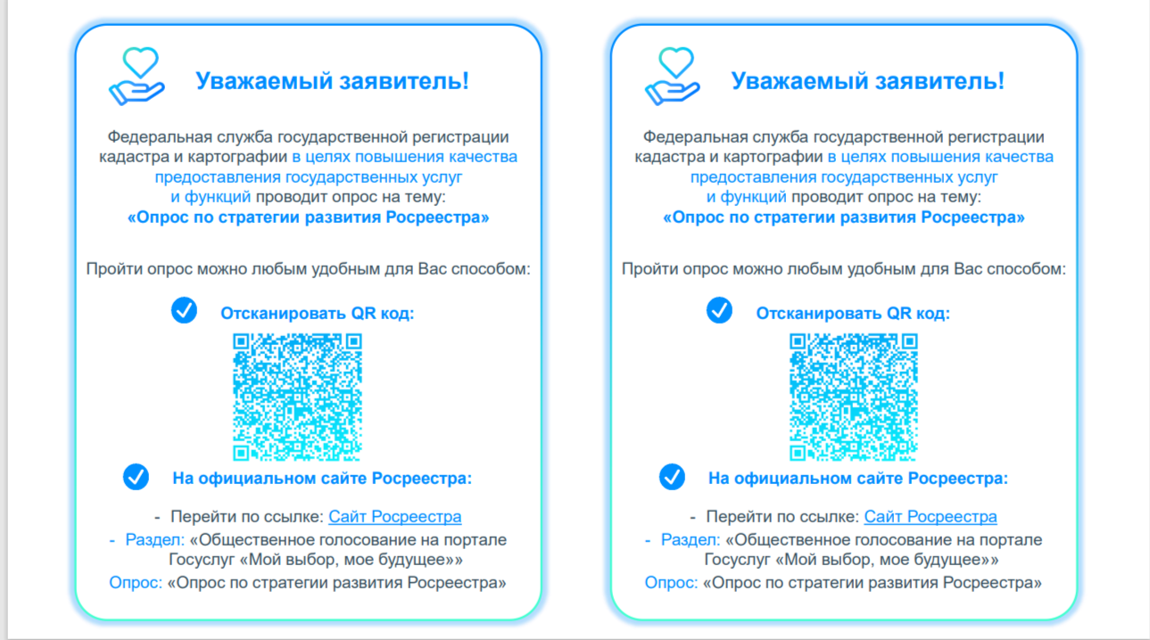Опрос размещен на главной странице официального сайта Росреестра в информационно-телекоммуникационной сети Интернет в разделе «Общественное голосование на портале Госуслуг «Мой выбор, мое будущее»», «Опрос по стратегии развития Росреестра». К опросу также можно перейти по QR – коду на листовке (прилагается), или по ссылке: https://pos.gosuslugi.ru/lkp/polls/443095/?utm_source=widget&utm_medium=federal&utm_campaign=pos.gosuslugi.ru.