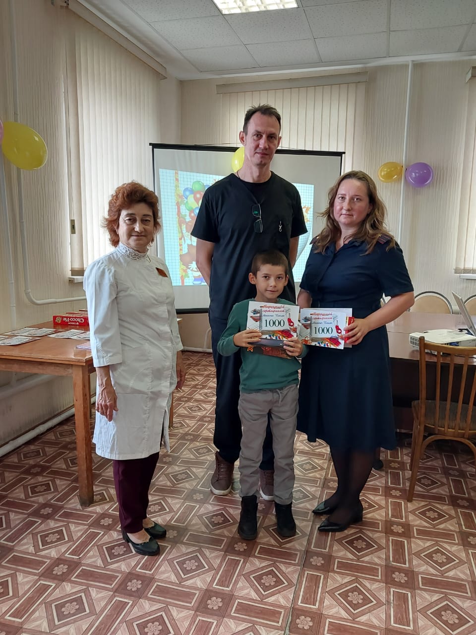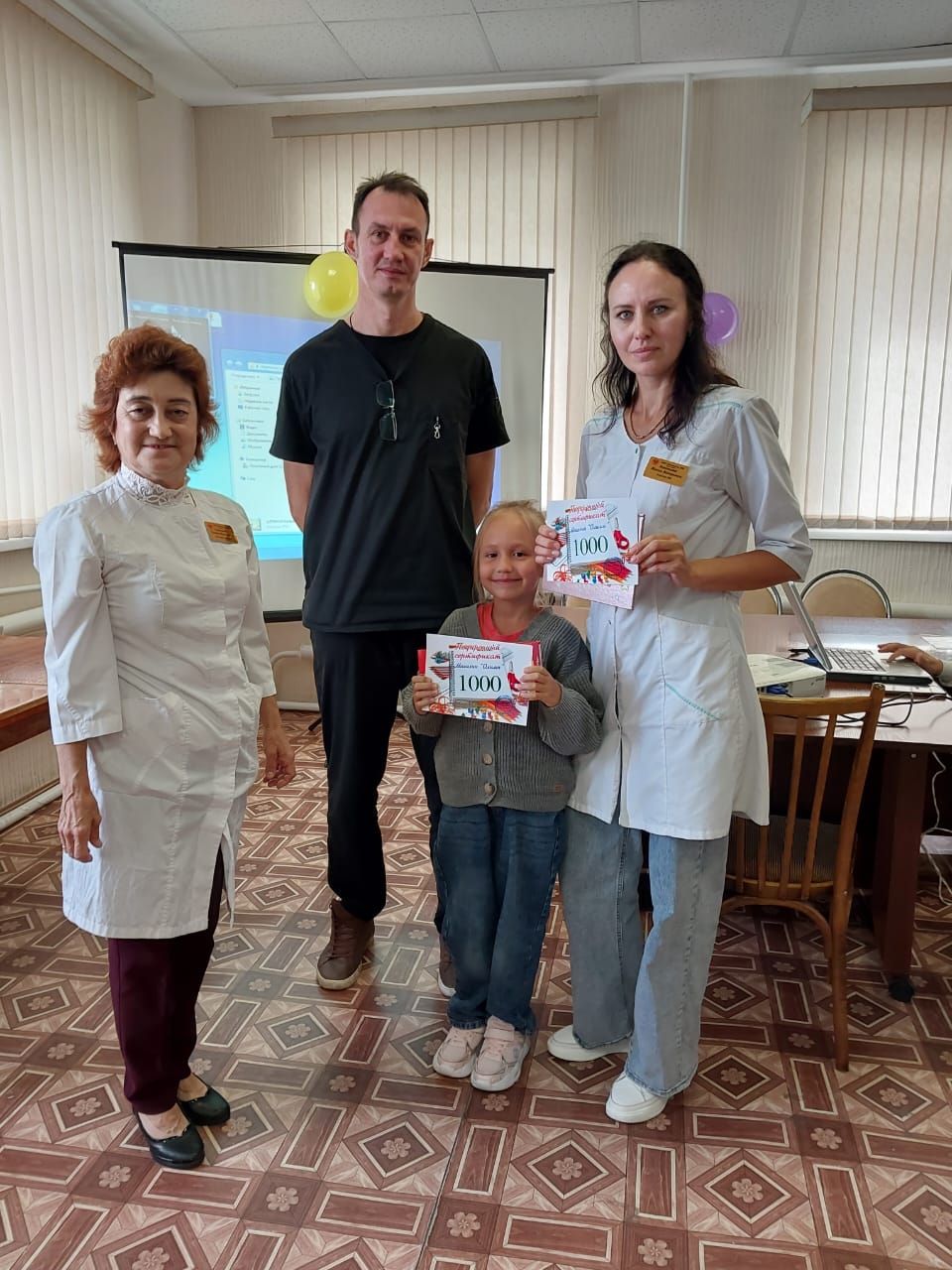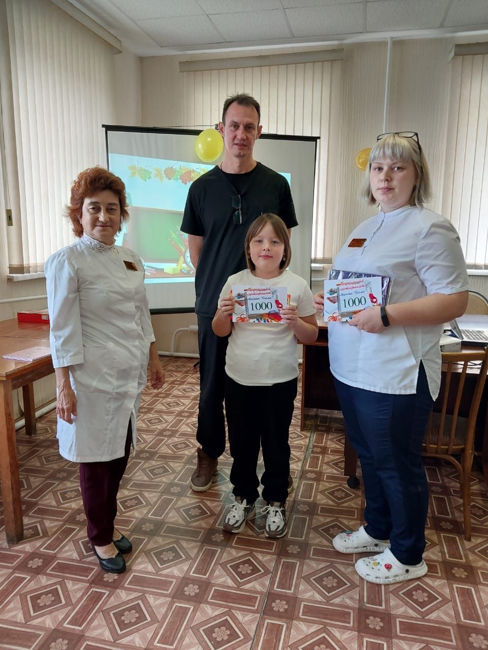 В торжественной обстановке заместителем главного врача А.В.Курцевым были вручены сертификаты для приобретения школьных портфелей и сладкие подарки.