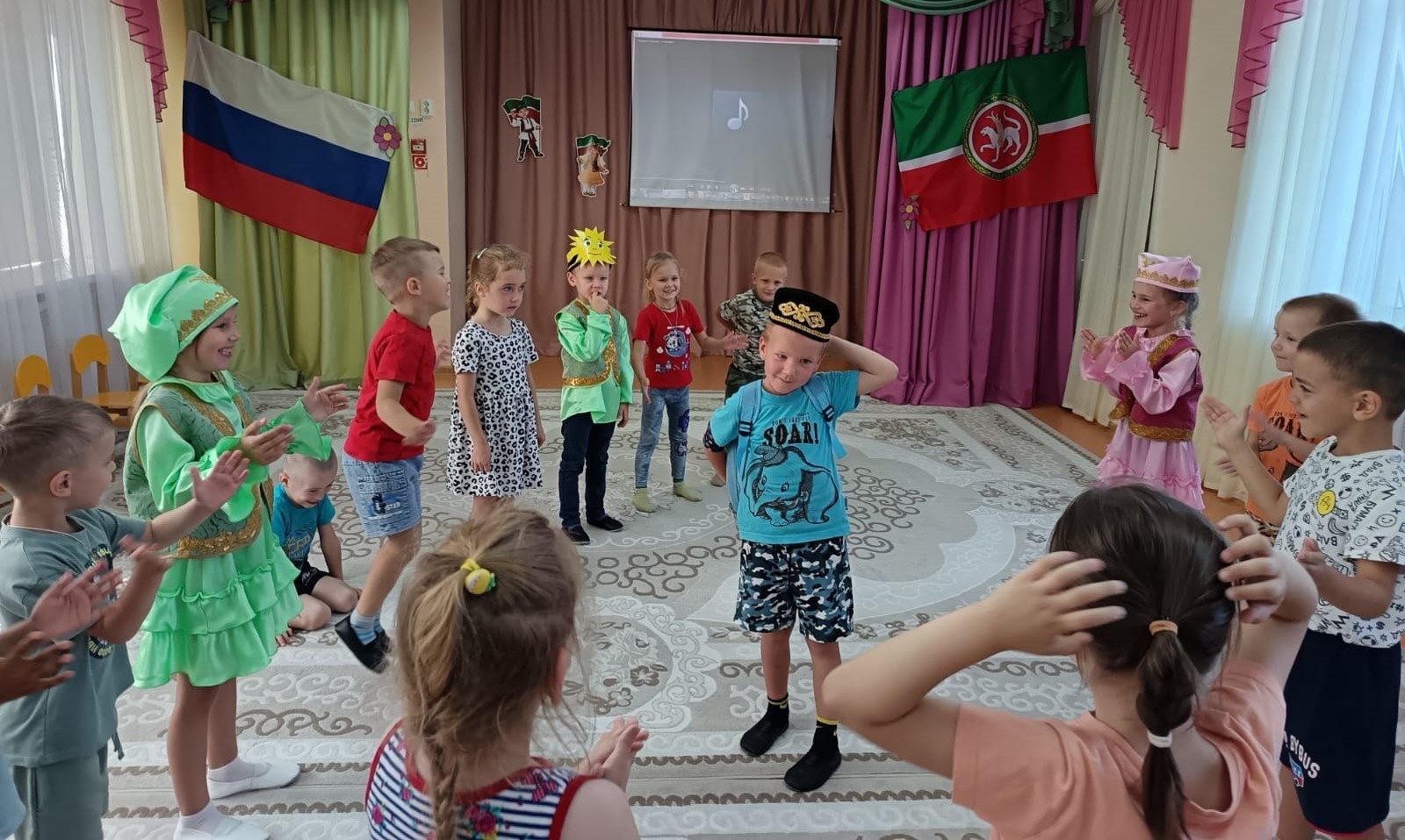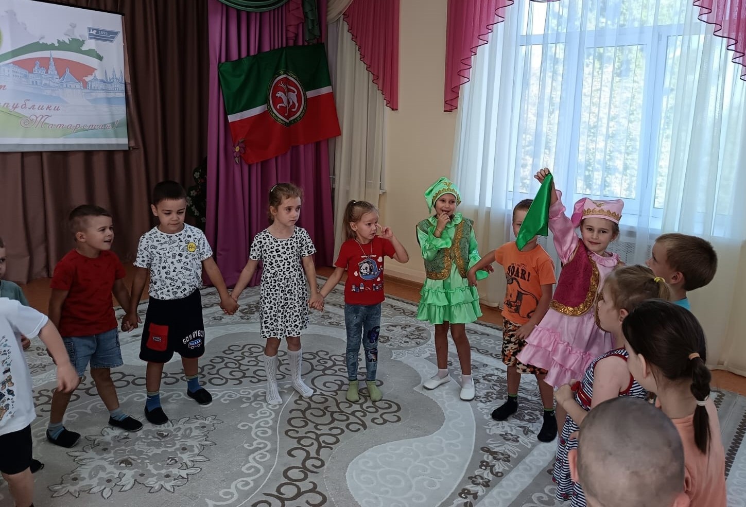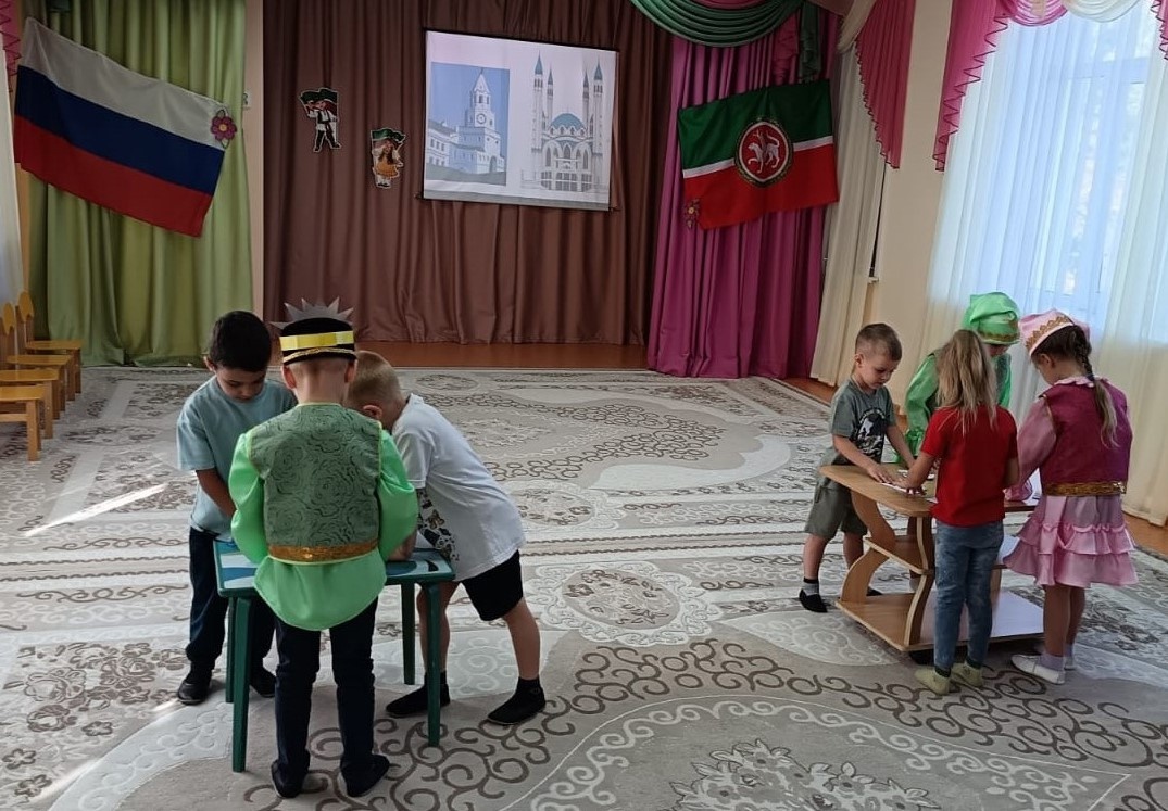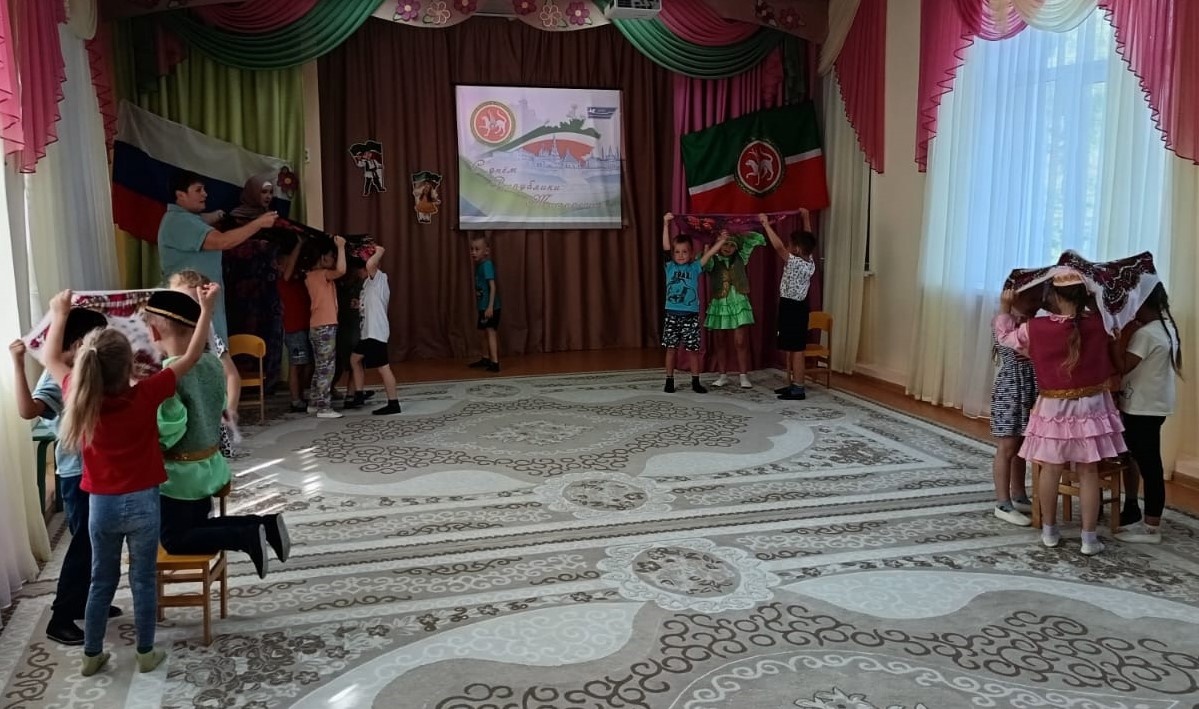Каждый год, 30 августа, наша Республика отмечает свой день рождения. Сегодня в нашем саду мы отметили День Республики Татарстан. Ребята вспомнили столицу и символы нашей республики – флаг, герб; слушали гимн. Также читали стихи о нашей Родине, отвечали на вопросы. Понравилось собирать разрезанные картинки достопримечательностей нашей столицы – Спасскую башню Казанского Кремля и Мечеть Кул Шариф. Особенно весело было играть в татарские национальные игры «Тюбетейка», «Займи место» (Буш урын) и другие.