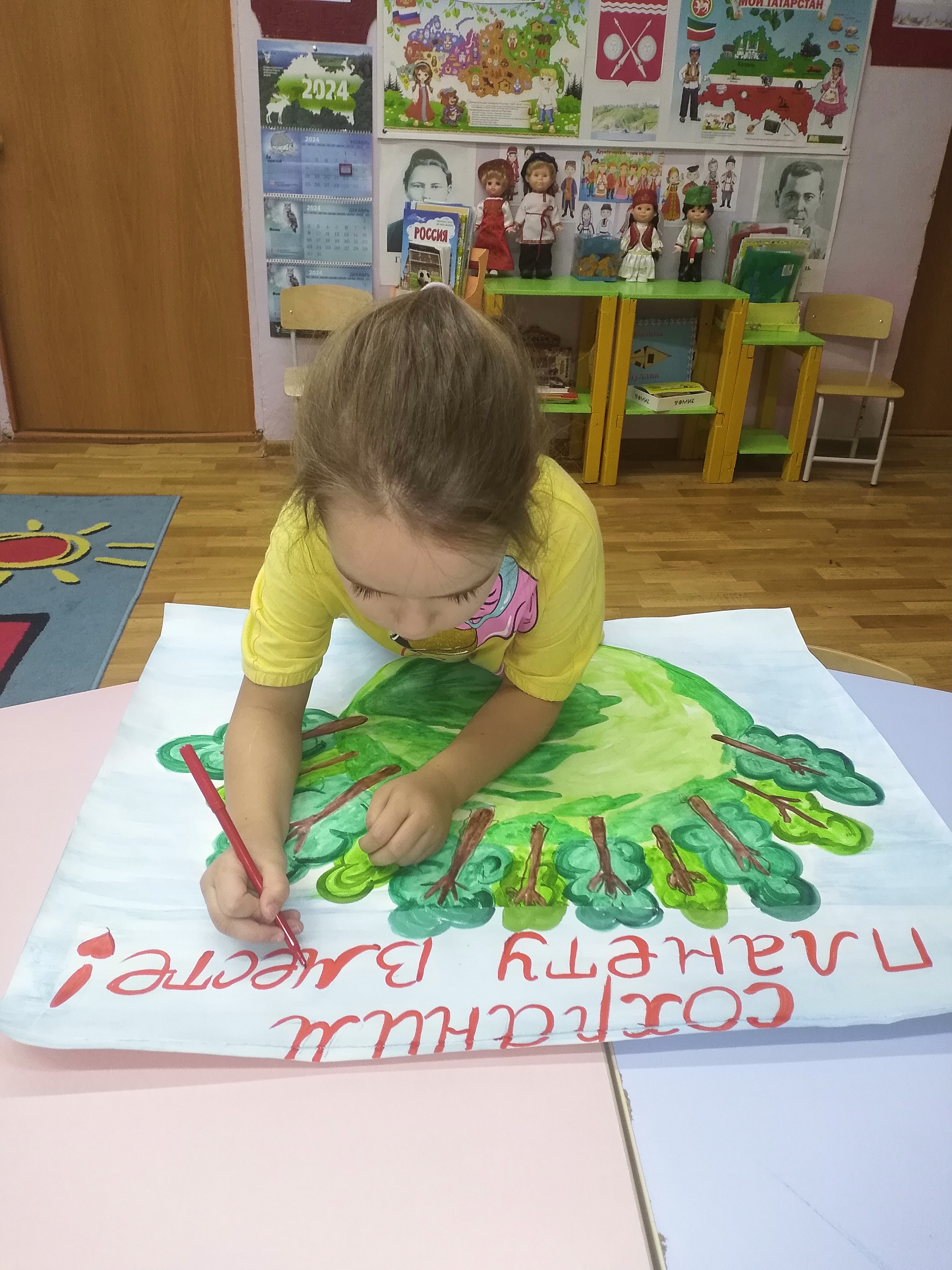 В завершении беседы дети нарисовали плакат "Сохраним планету вместе!".