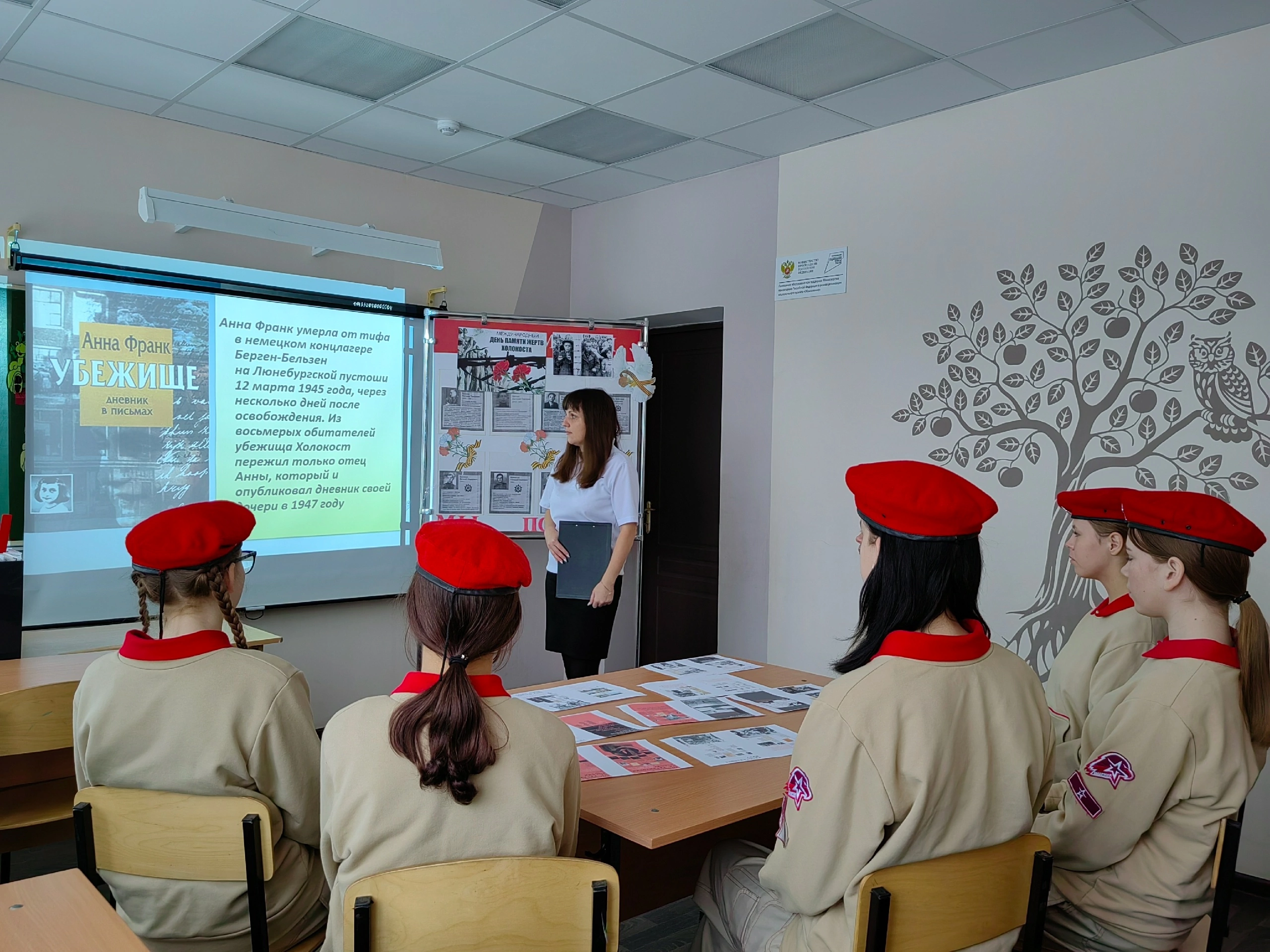 Советник директора по воспитанию Игнатьева А. С. организовала круглый стол «Черно- белый мир: воспитание через фотоснимки». Мероприятие сопровождалось показом интерактивной выставки Центра «Холокост». Юнармейцы смогли почувствовать через фотографии атмосферу тех лет и осознать масштабы трагедии.