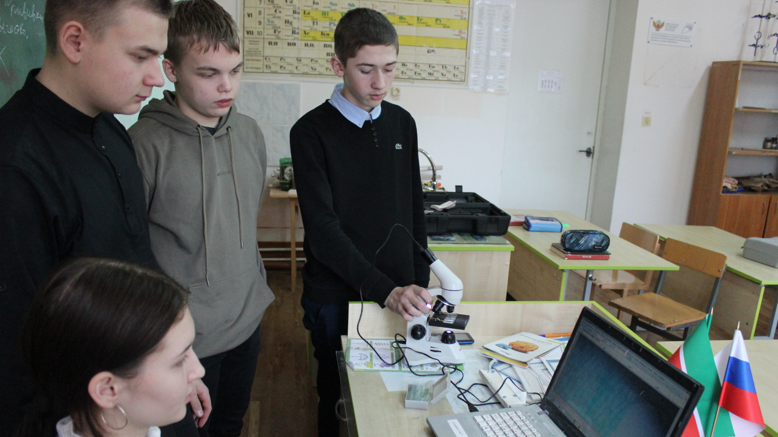 Занятия проходят в кабинете биологии, который полностью оснащен в рамках проекта. 28 января учитель химии и биологии Большаков В.И. в рамках внеурочной деятельности провел практическое занятие по теме «Микроскопирование - изучение микропрепаратов с помощью электронного микроскопа». Ребята познакомились с понятиями и провели лабораторные исследования: Микропрепарат поперечного среза корня аира в зоне точки роста и корневого чехлика; Микропрепарат ноги кузнечика; Микропрепарат крыла бабочки; Неокрашенный препарат чешуи лука; Окрашенный препарат чешуи лука.