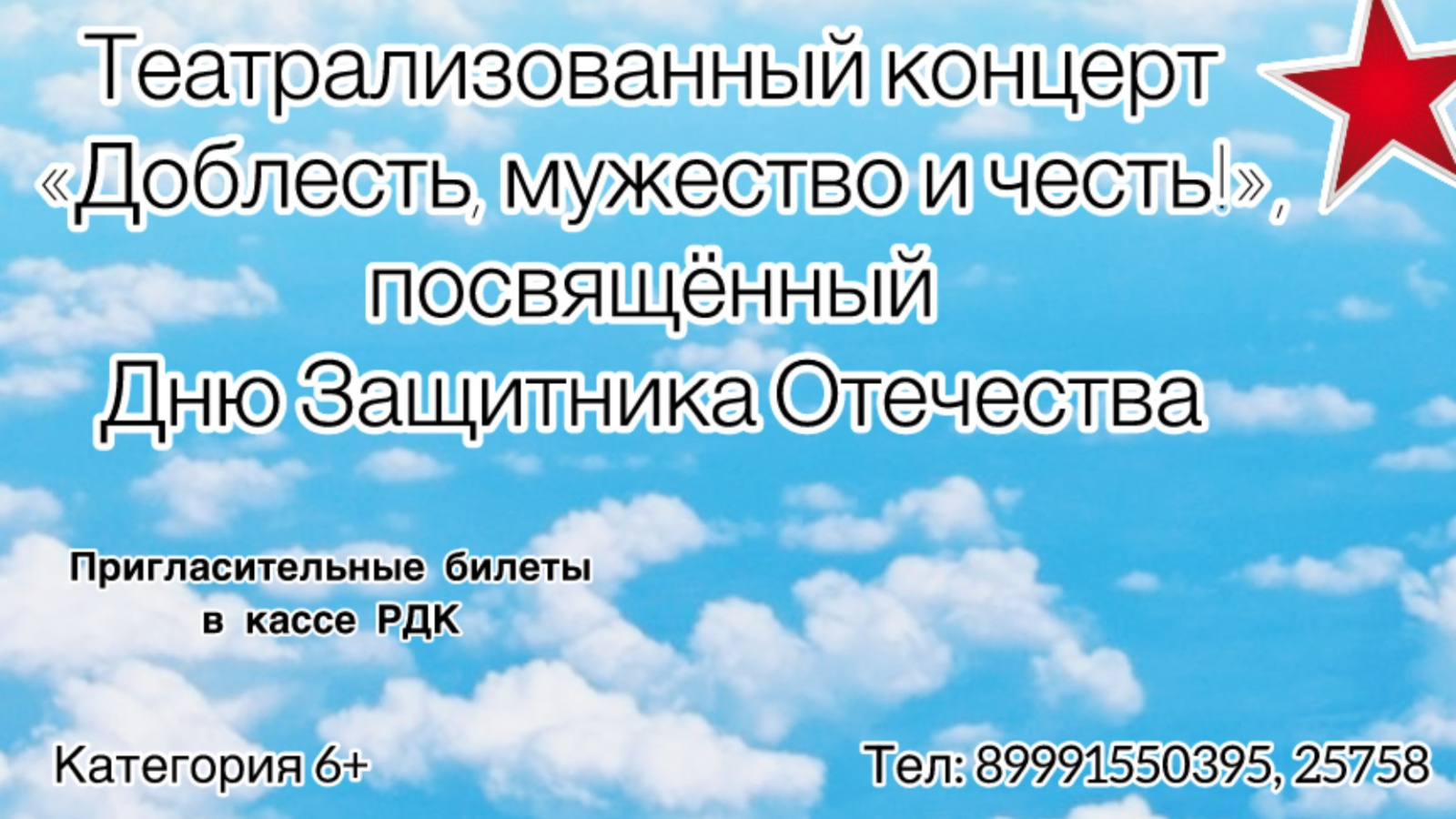20 февраля в 17.30 ч. в Тетюшском районном Доме культуры состоится театрализованный концерт «Доблесть, мужество и честь!», посвященный Дню Защитника Отечества и 80-летию Победы в Великой Отечественной войне, в рамках Года защитника Отечества в Российской Федерации и Республике Татарстан.