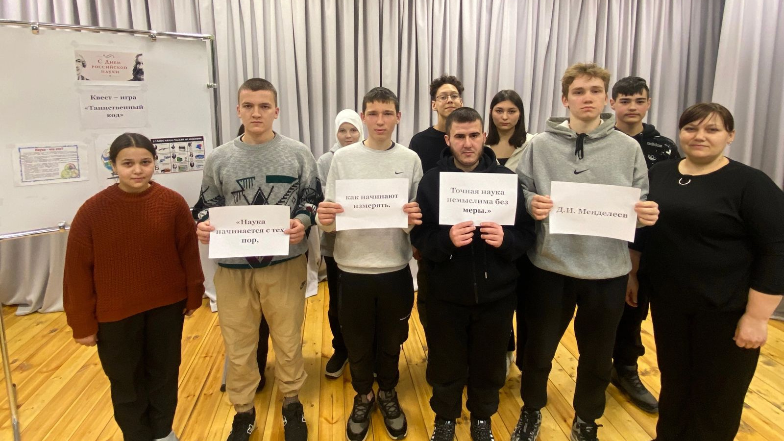Каждой из команд предстояло пройти станции: математическая, историческая, исследовательская и вопросы на засыпку. Участники мероприятия продемонстрировали эрудицию, находчивость и знания. Ребята познакомились с открытиями, инновационными разработками и перспективными исследованиями российских ученных. Выполнив все задания, собрав все фрагменты заданных высказываний и цитат Дмитрия Менделеева, дошли до финиша.