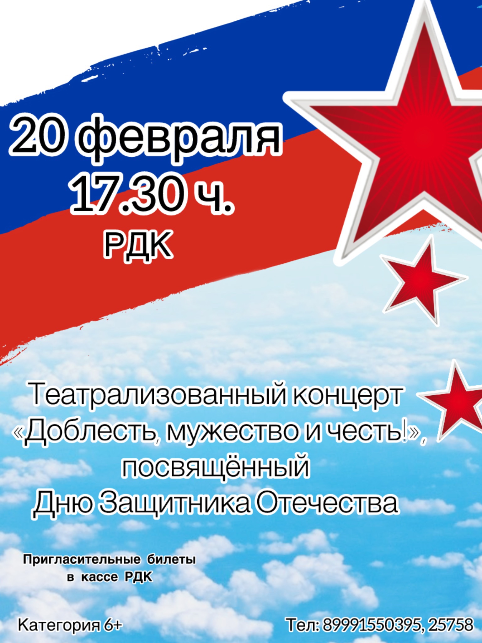 20 февраля в 17.30 ч. в Тетюшском районном Доме культуры состоится театрализованный концерт «Доблесть, мужество и честь!», посвященный Дню Защитника Отечества и 80-летию Победы в Великой Отечественной войне, в рамках Года защитника Отечества в Российской Федерации и Республике Татарстан. Приглашаем всех желающих! Вход по пригласительным билетам, которые предварительно можно получить в кассе районного Дома культуры.