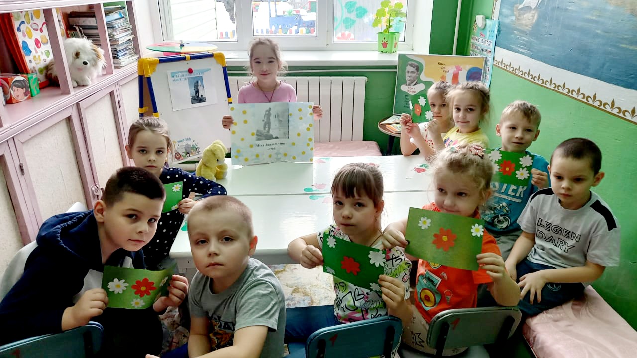 Ребята прослушали его произведения «Храбрый заяц», «Мой пёс», «Красная ромашка» и «Песня о храбром джигите». На произведение «Красная ромашка» ребята выполнили аппликацию с изображением ромашки. Дети должны знать таких героев, как М. Джалиль, которые боролись и отдавали свои жизни за Родину, проявляя свое мужество и героизм.