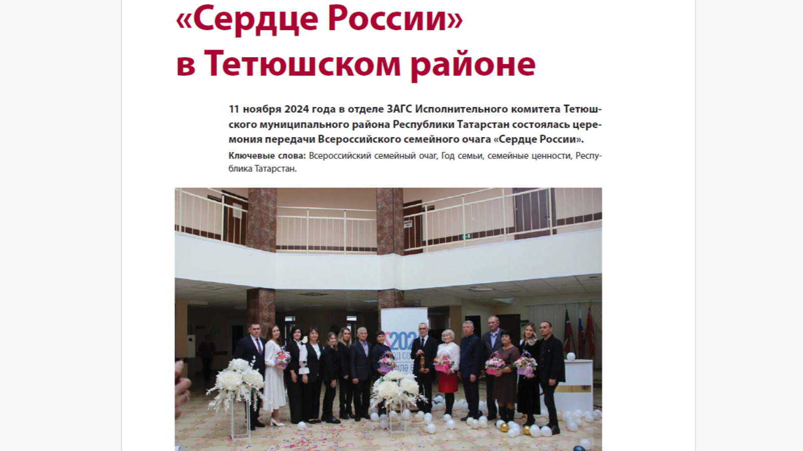 Нередко на страницах российского журнала «ЗАГС» освещаются материалы, посвященные деятельности работников органов ЗАГС Республики Татарстан, в том числе отдела ЗАГС Исполнительного комитета Тетюшского муниципального района. Отдел ЗАГС тесно сотрудничает с журналом и предоставляет свои материалы. Так, в январском номере размещен материал «Сердце России в Тетюшском районе»