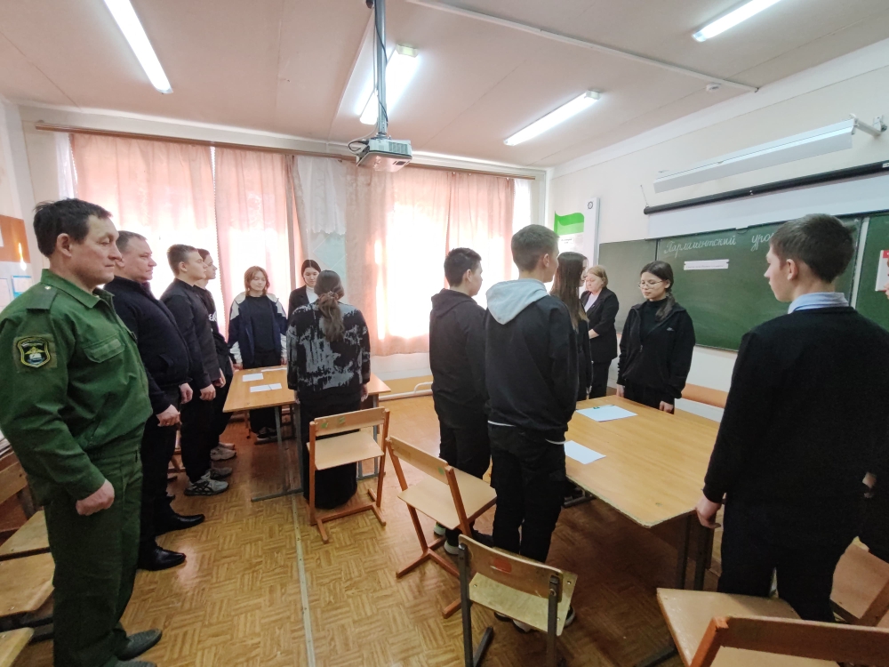 В целях правового просвещения, формирования активной гражданской позиции и ответственного отношения к вопросам сохранения исторической памяти, воспитания патриотизма и углубления знаний учащихся о героическом прошлом нашего Отечества, поощрения их творческой активности МБОУ "Урюмская СОШ" провели парламентский урок «Святое дело – Родине служить!», приуроченные к Году защитника Отечества и 80-летию Победы в Великой Отечественной войне.