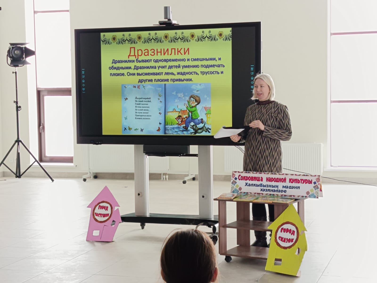 Библиотекарь детской библиотеки рассказала детям о русском фольклоре — сокровищнице народной мудрости. Она подчеркнула, что это искусство обладает удивительной притягательной силой, которую ощущает каждый, кто с ним соприкасается.