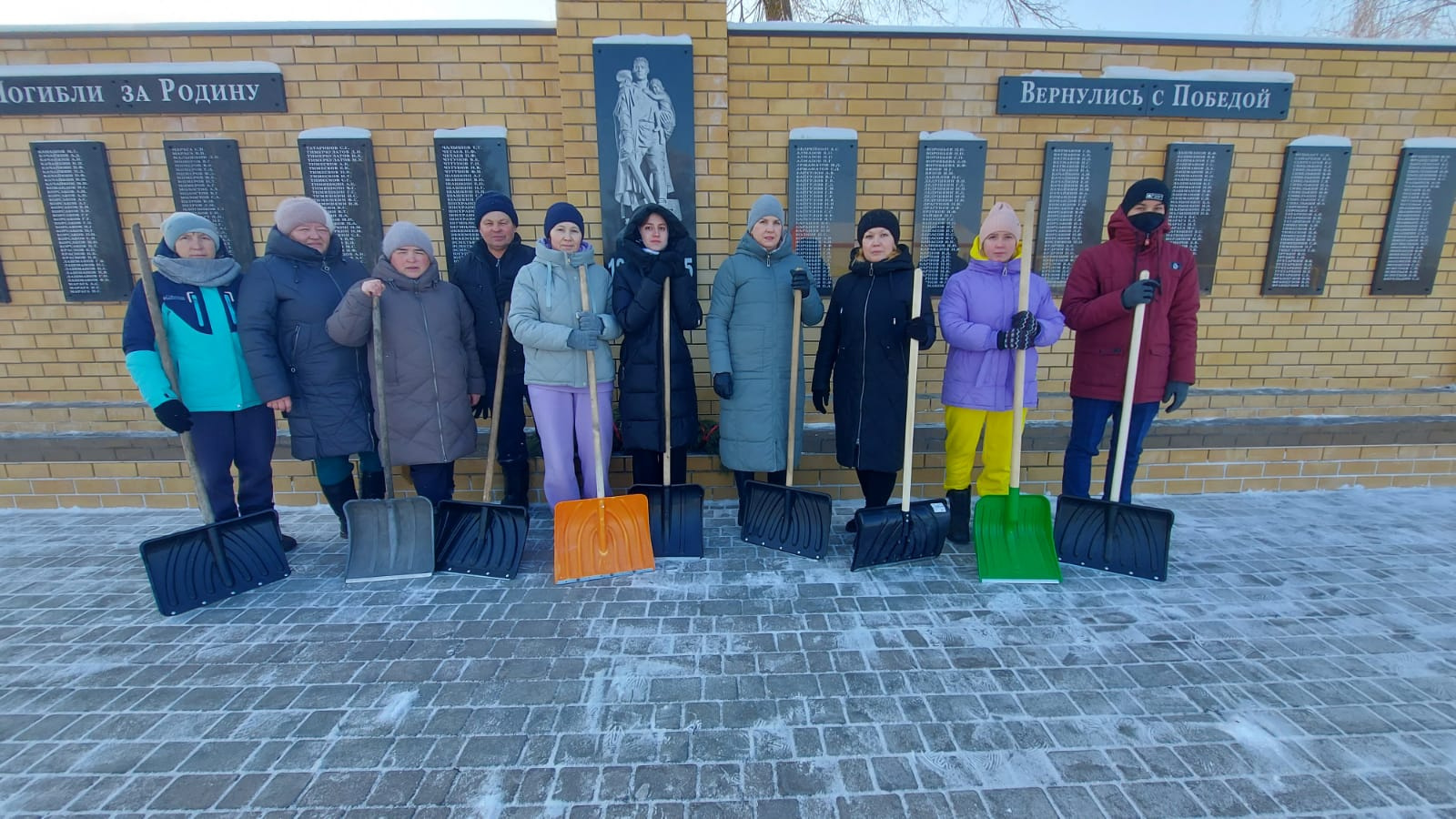 С утра, вооружившись лопатами и хорошим настроением, убрали снег, дружно потрудились.