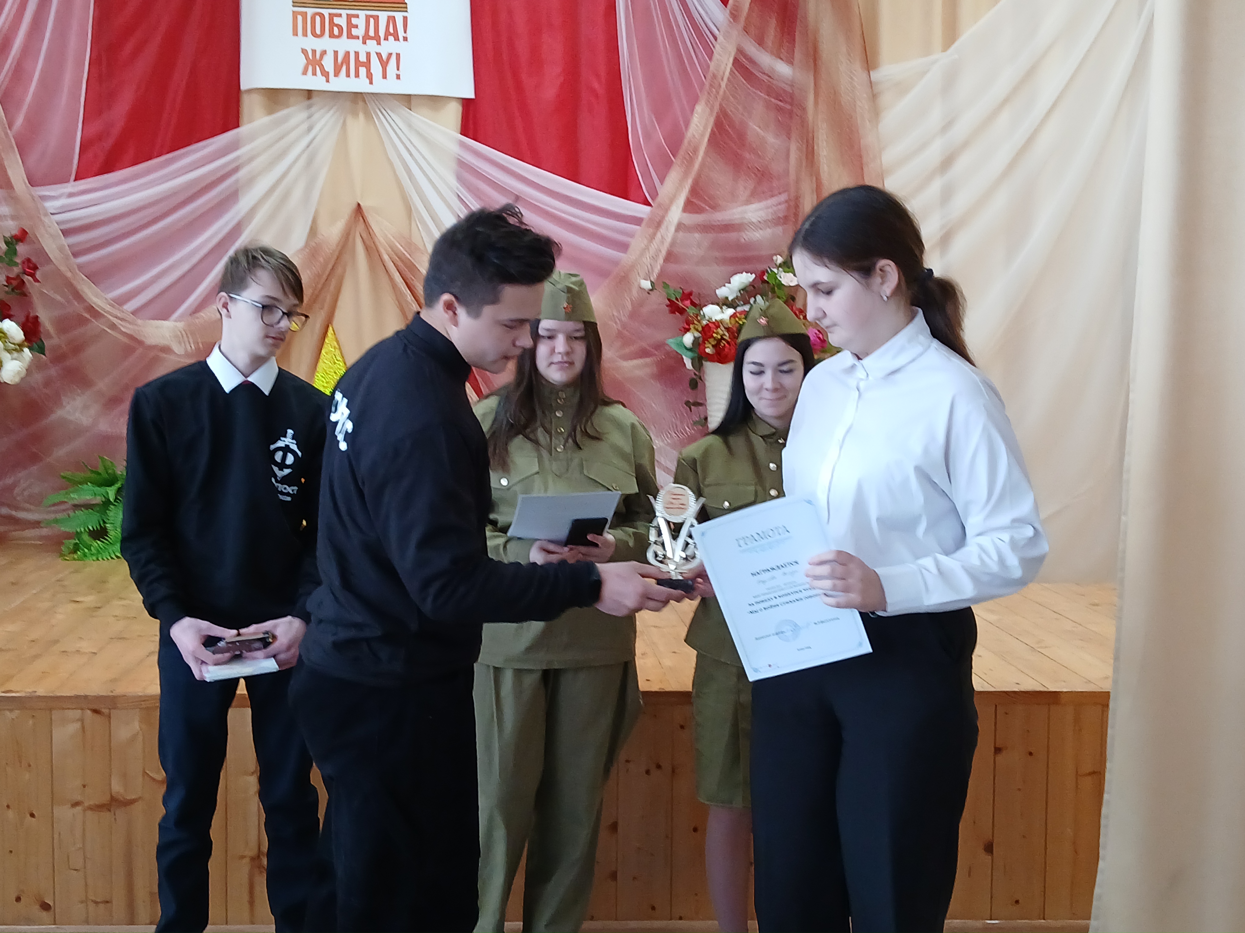В рамках Года защитника Отечества учащиеся 9а класса, члены школьного отряда "Форпост" МБОУ "Тетюшская СОШ №1 им.Ханжина П.С.", провели в 6в классе конкурс чтецов "Мы о войне стихами говорим" (руководитель: Л.Г.Шарафиева). Учащиеся продекламировали стихотворения и отрывки из прозы на военную тематику. Победителю конкурса был вручён кубок, призеры награждены памятными сувенирами.