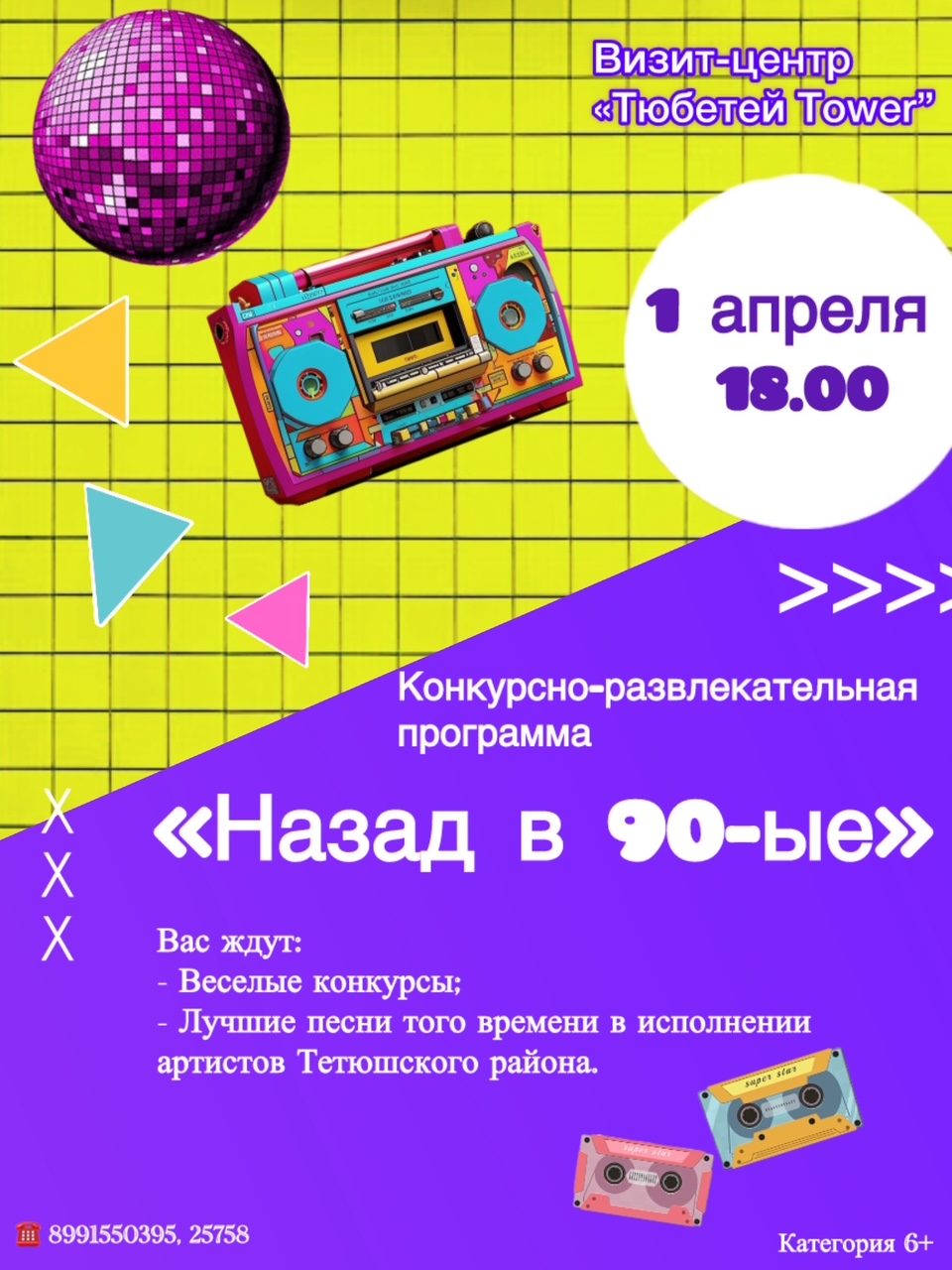 1 апреля в 18:00 часов в визит-центре «Тюбетей Tower» г.Тетюши (Северный микрорайон города) состоится конкурсно-развлекательная программа «Назад в 90-е», в рамках Дня смеха. Приглашаем всех окунуться в атмосферу легендарных 90-х! Участников ждут яркие конкурсы, задорные песни и танцы, а также незабываемые моменты из эпохи, когда мода была яркой, музыка — зажигательной, а жизнь — полной сюрпризов! Призы, смех и отличное настроение гарантированы! Не пропустите шанс вернуться в эпоху, где каждый день был праздником! Ждем всех желающих!