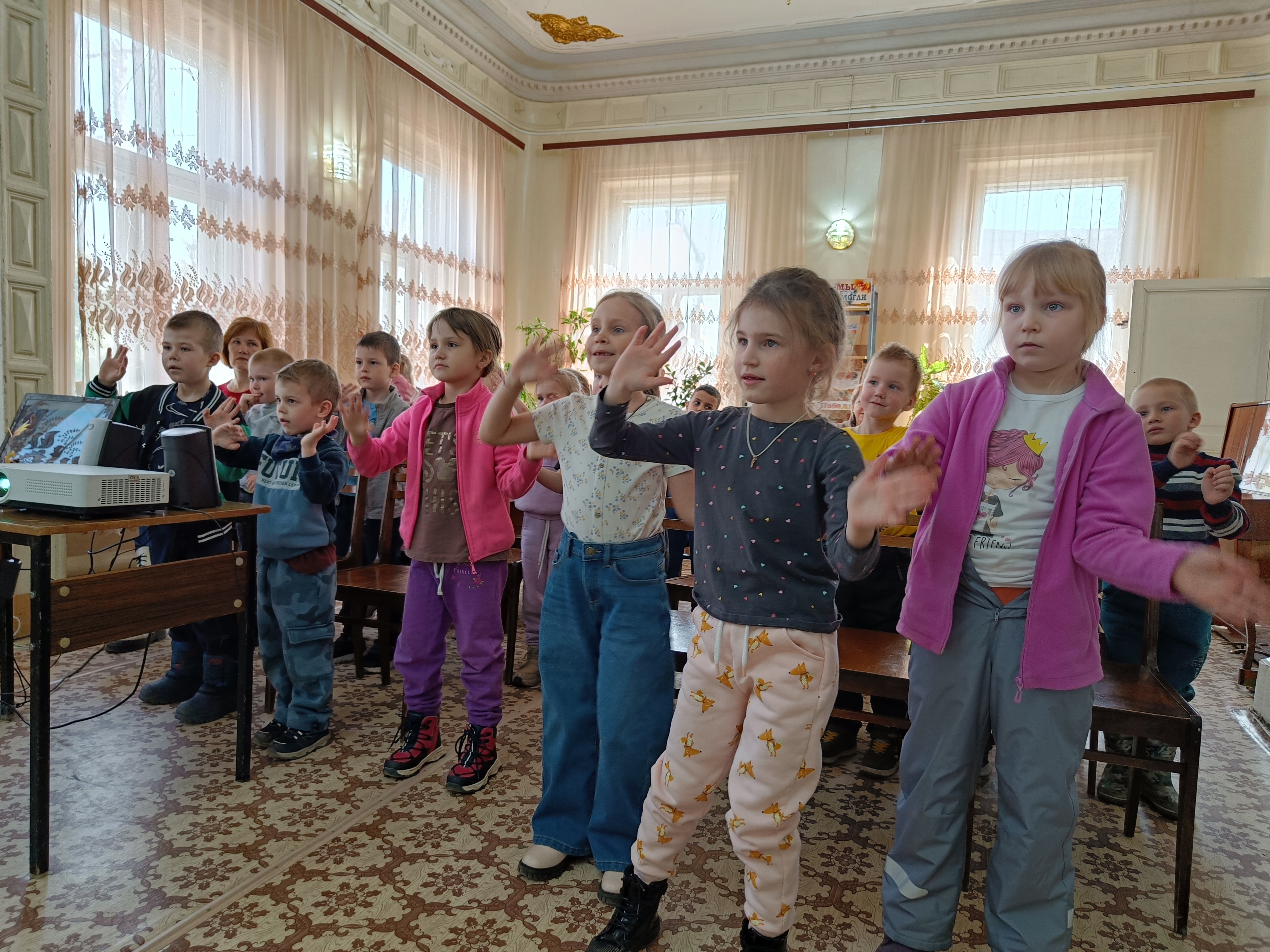 Особенно запомнилась весёлая и оживлённая физкультминутка, во время которой ребята танцевали вместе с персонажем мультфильма.