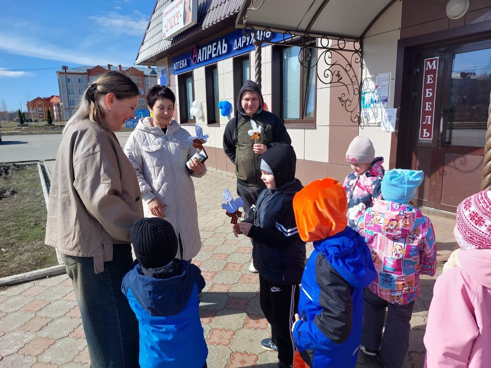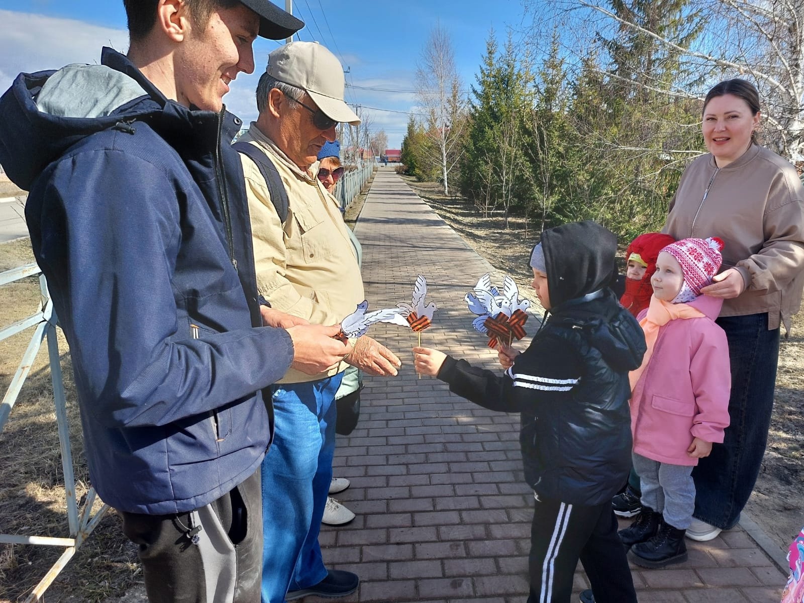 Педагог провела беседу с детьми о том, что символом мира является белый голубь, а выражение «Голубь – птица мира» стало популярным после окончания Великой Отечественной войны. Ребята изготовили голубей и вручили их прохожим, так же рассказали стихи.