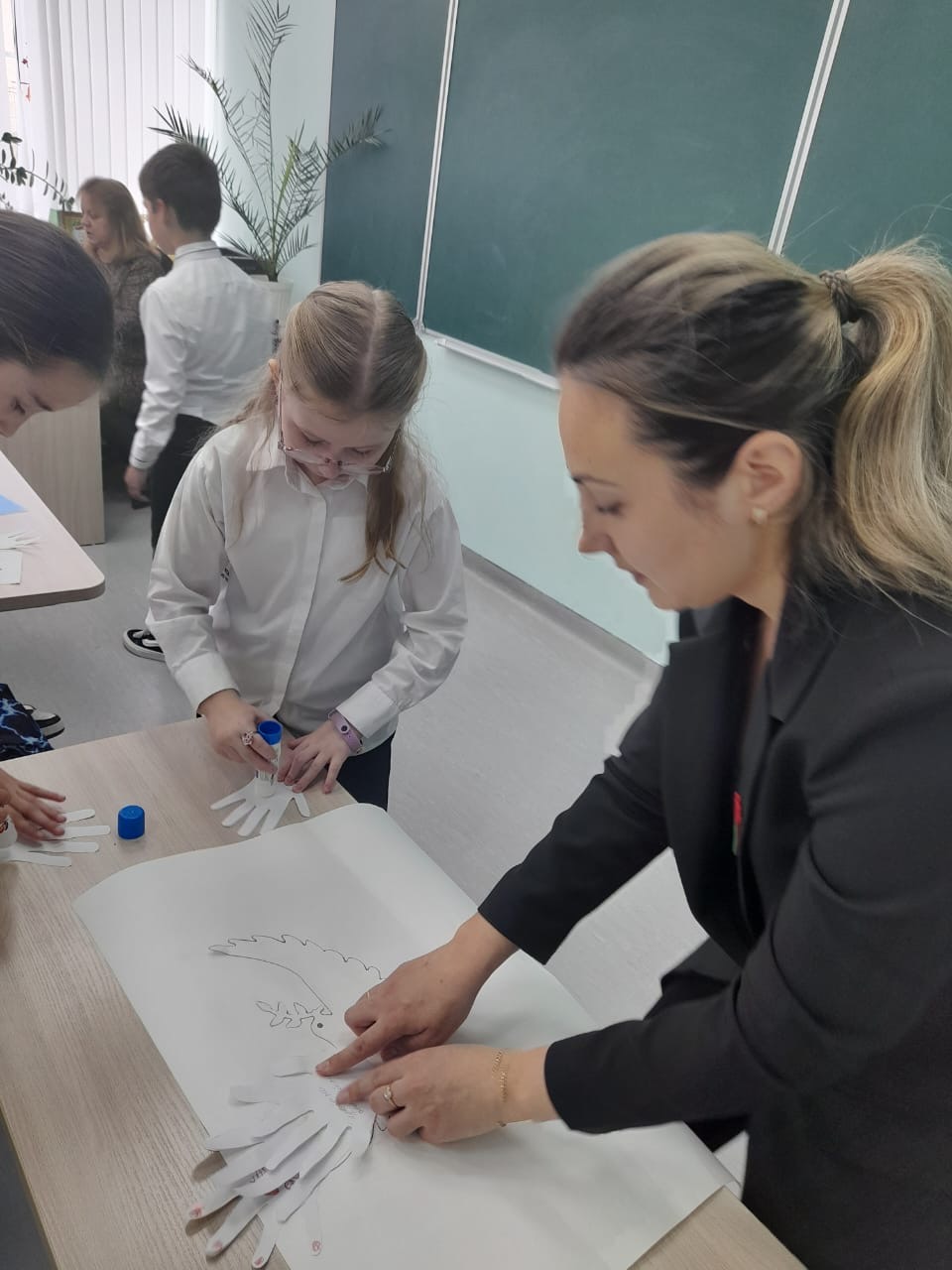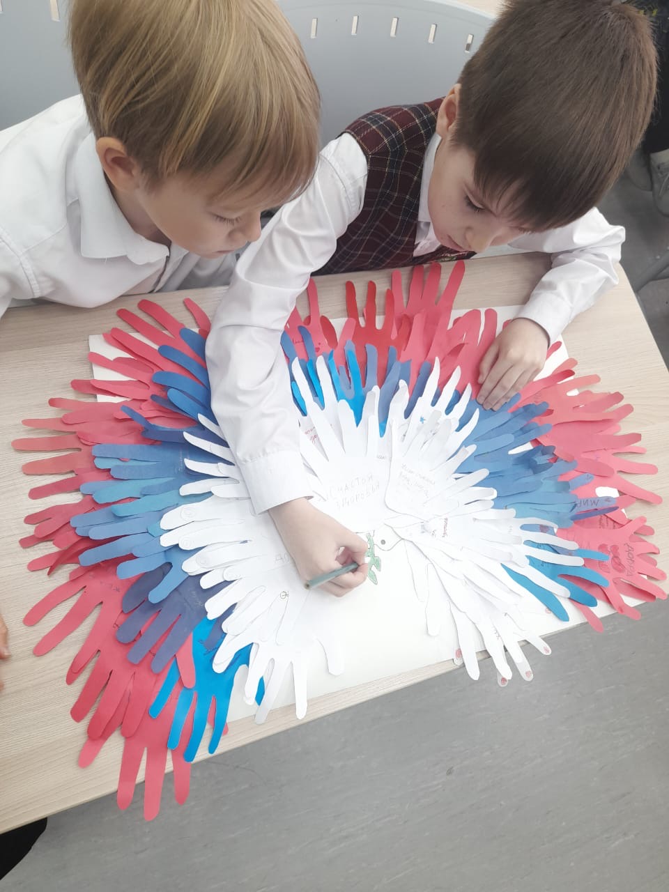 Ребята вырезали из бумаги ладошки, символизирующие мир и память о героях войны, а также тщательно продумывали слова поддержки и признания воинам разных лет, вкладывая в них личные размышления о значении Победы.