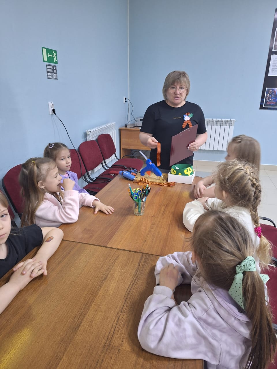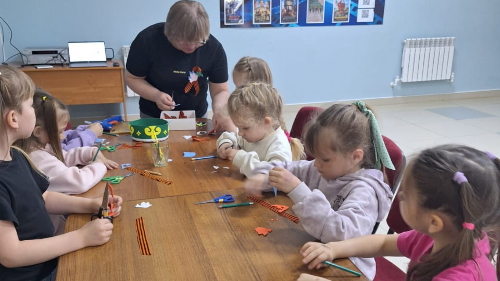 Мастер-класс начался с краткого рассказа об истории знака Победы. Детям объяснили, что георгиевская лента – это не просто украшение, а символ памяти, уважения к ветеранам и благодарности за мирное небо над головой.