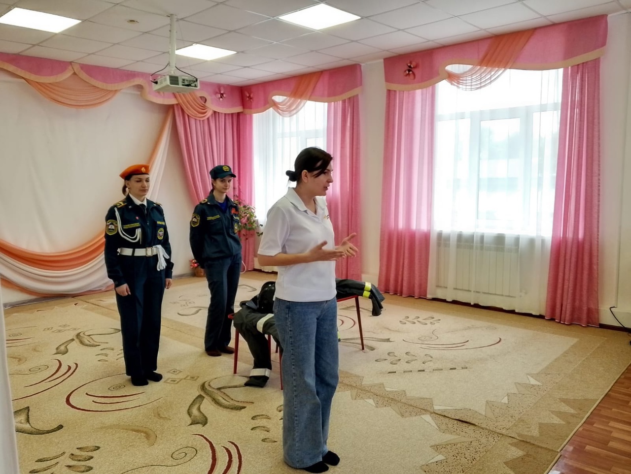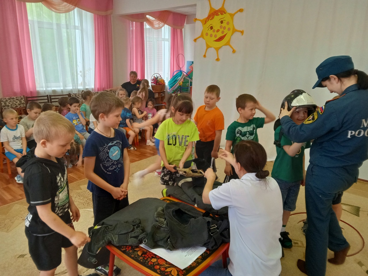 Самым запоминающимся для детей было знакомство с костюмом пожарного, воспитанники смогли почувствовать себя в роли пожарных и примерить настоящий шлем пожарного. Также курсанты напомнили номера экстренных служб.