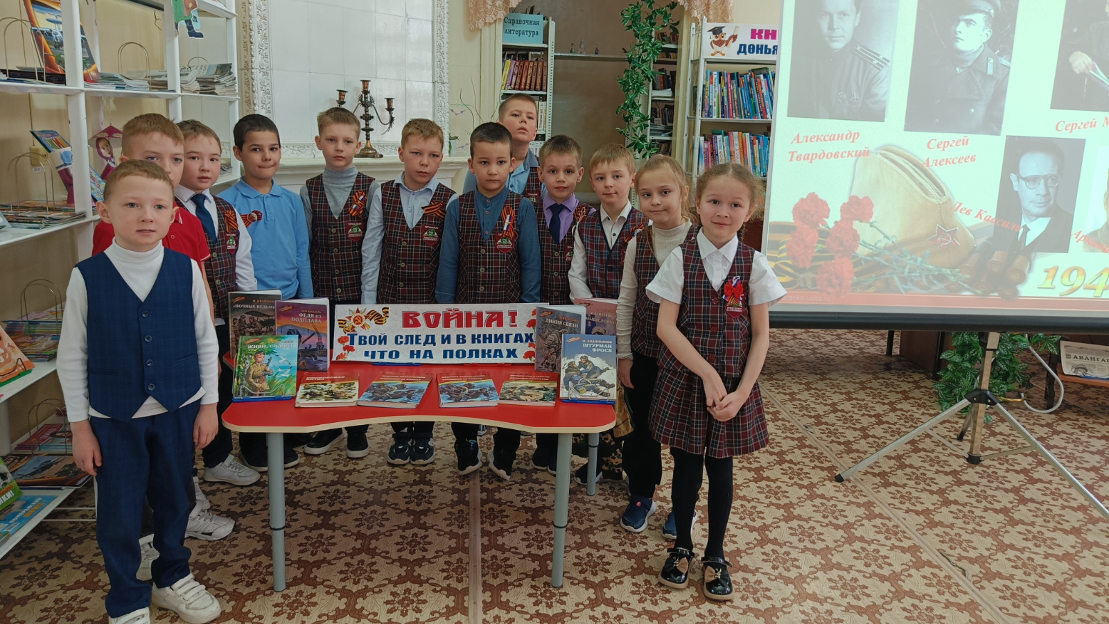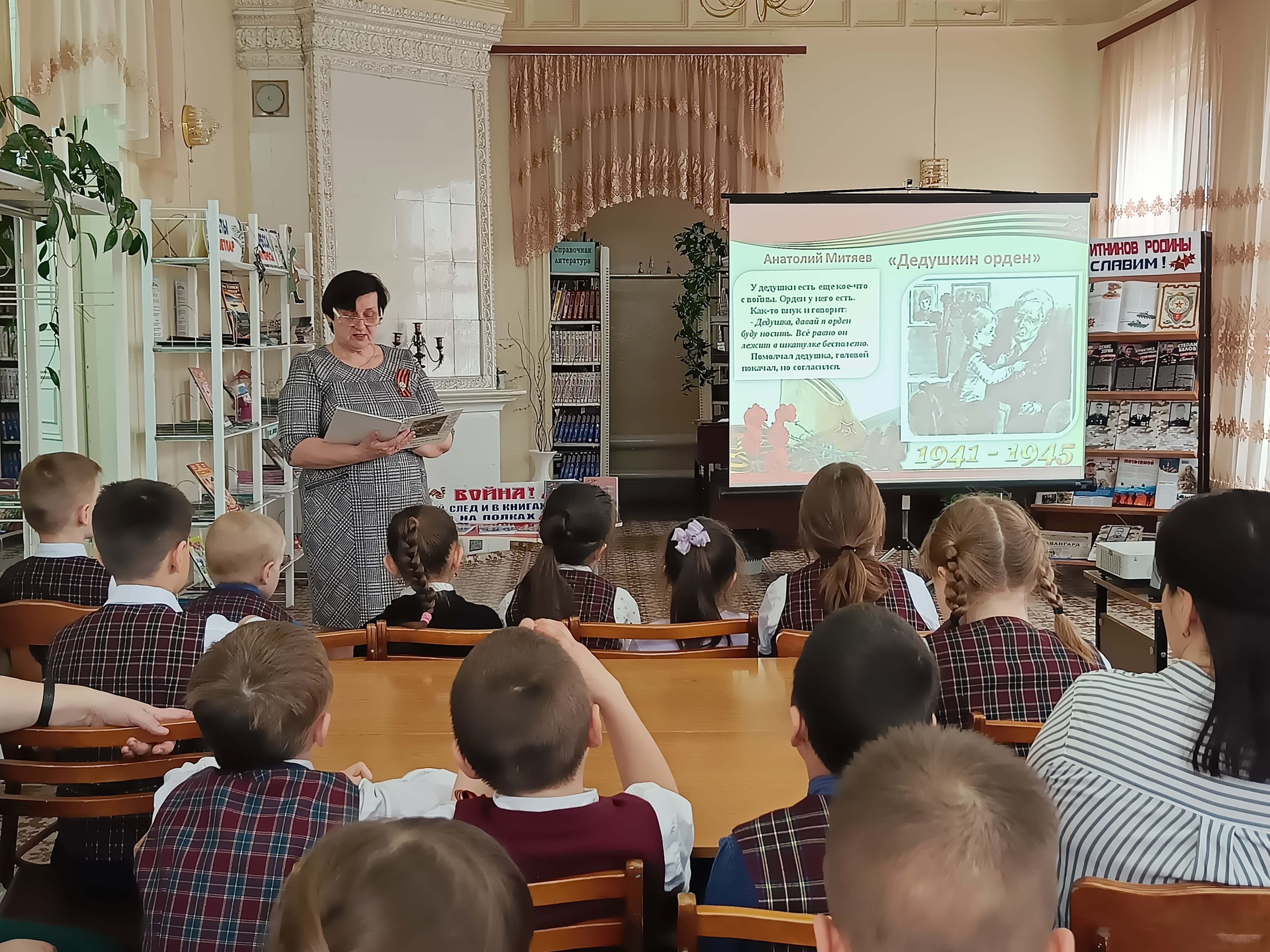 В начале встречи ребята ответили на вопрос «Зачем нужно читать книги о войне?». Дети рассуждали о том, что историю родной страны обязательно нужно знать, потому что много людей отдали свои жизни в борьбе с фашизмом, защищая родную землю. Затем ребята познакомились с биографией и произведениями А. Митяева «Дедушкин орден» и С. Алексеева «Орлович-Воронович». Юные читатели с интересом слушали истории о Великой Отечественной войне, обсуждали их, делились своими мыслями и отвечали на вопросы.