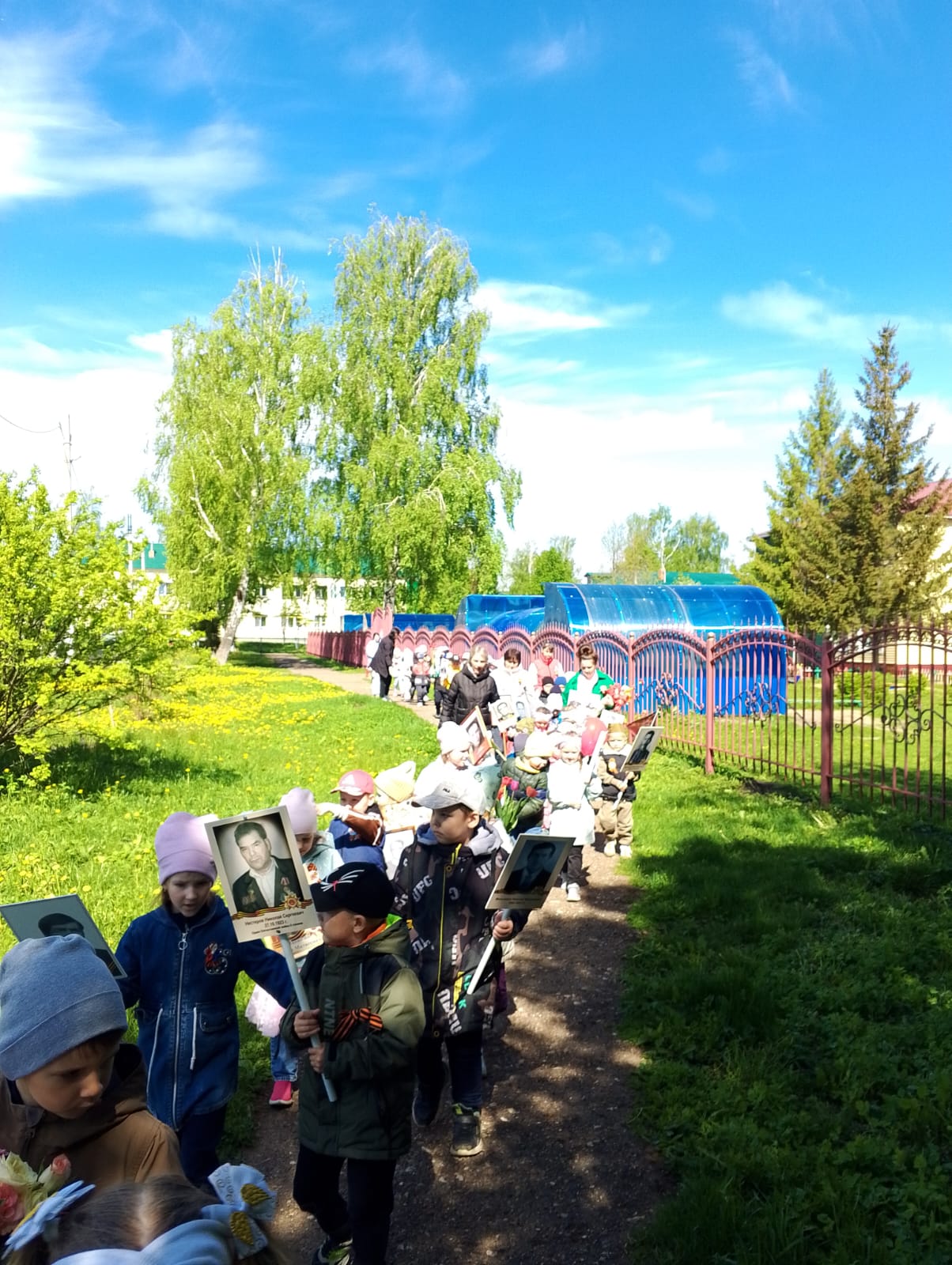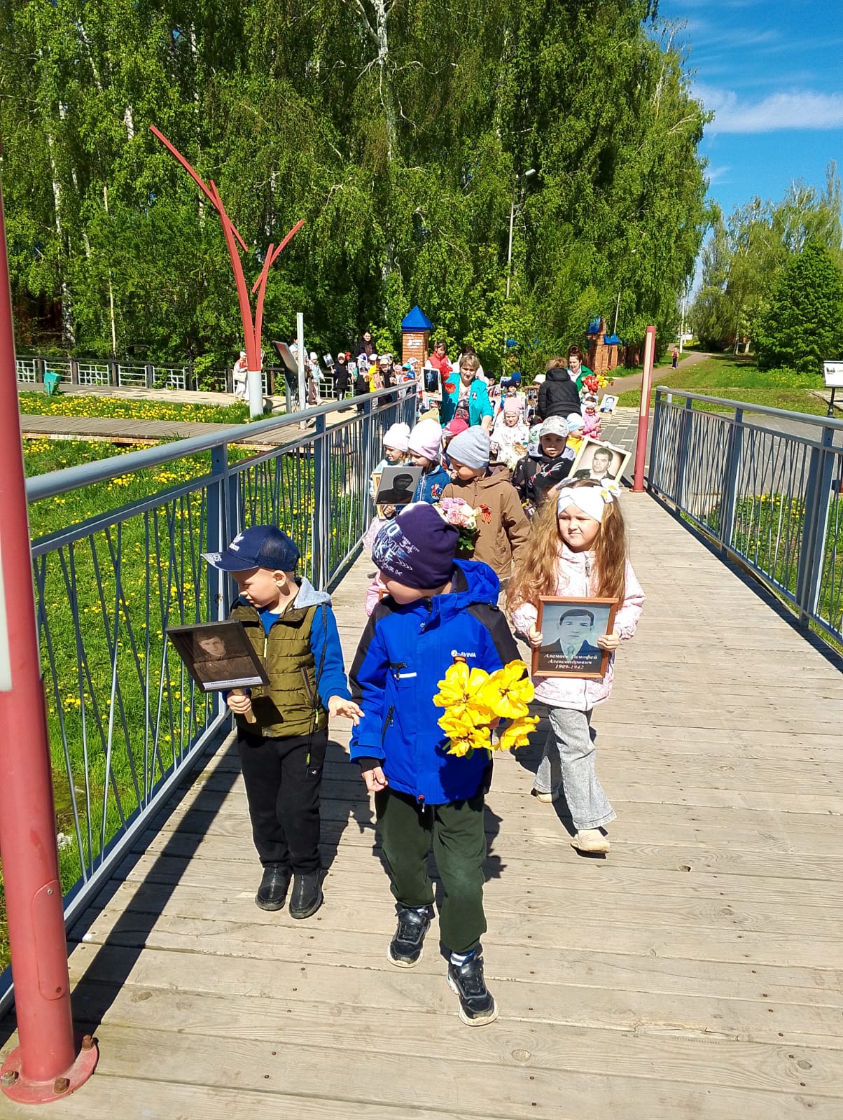По окончании мероприятия, по традиции воспитанники и сотрудники детского сада возложили цветы к монументу Славы нашего города. Колонна шествия к монументу Славы растянулась далеко, в руках детей фотографии победителей - прапрадедов!