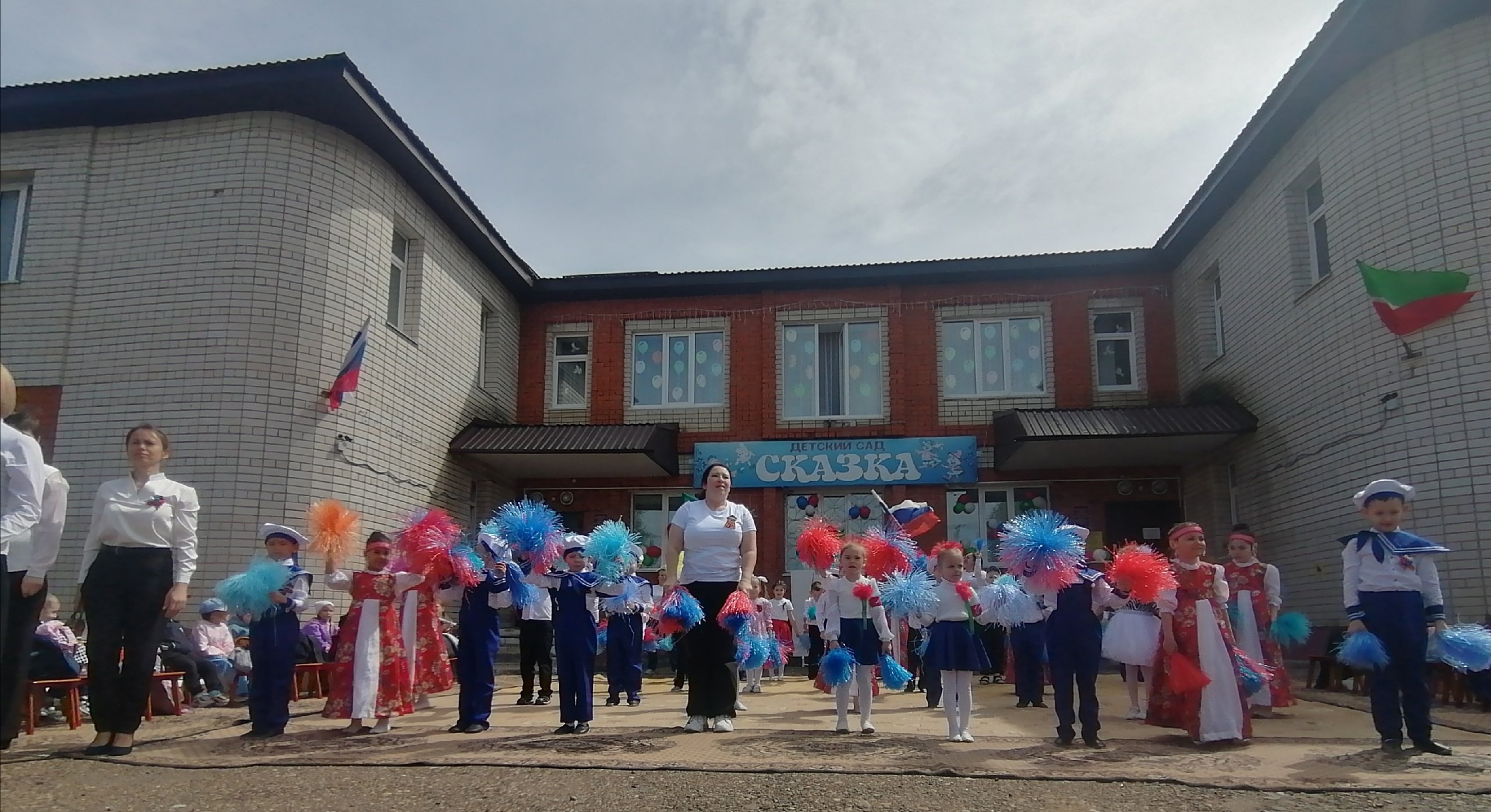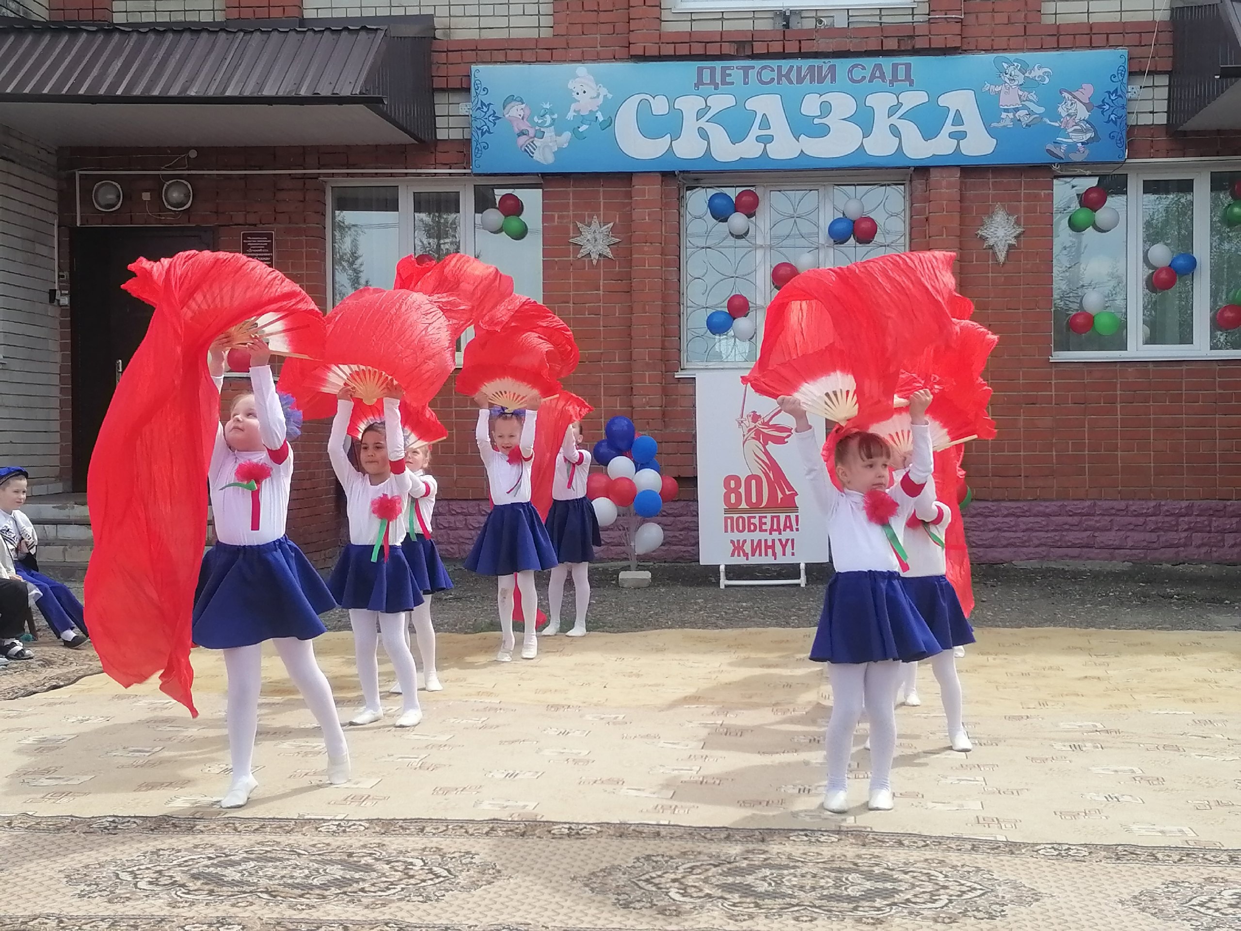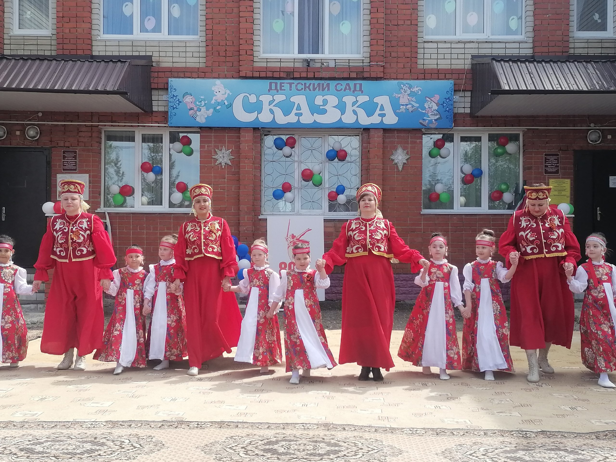 Сегодня воспитанники и сотрудники детского сада «Сказка» представили для жителей южного микрорайона города концертную программу «Весна Победы», посвященную 80-летию великой Победы. Дети подготовили стихи, танцы и песни. Минутой Молчания дети и взрослые почтили память всех героев, погибших на полях сражений.