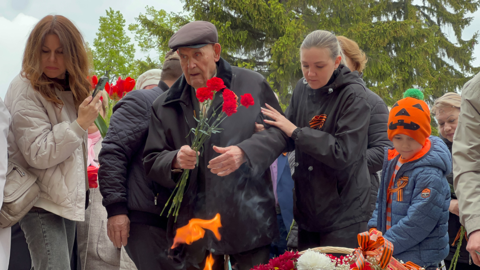 Собравшиеся почтили память павших героев Минутой Молчания и возложили цветы к Огню Памяти. Торжественное мероприятие, посвященное 80-летию Победы в Великой Отечественной войне, продолжилось театрализованным прологом.