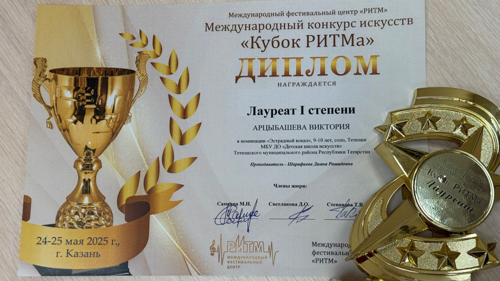 Виктория награждена дипломом ЛАУРЕАТА 1 степени, специальным дипломом «За артистизм» и памятным кубком. Преподаватель Шарафиева Диана Рашидовна благодарственным письмом за высокий профессиональный уровень подготовки участника.