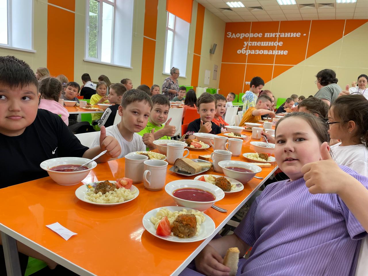 За обедом ребята с удовольствием съели и первое, и второе, и десерт.