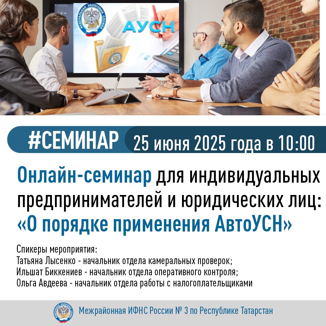 Межрайонная инспекция ФНС России № 3 по Республике Татарстан приглашает принять участие в онлайн-семинаре в формате видеоконференции, посвящённый особенностям применения автоматизированной упрощённой системы налогообложения (автоУСН).