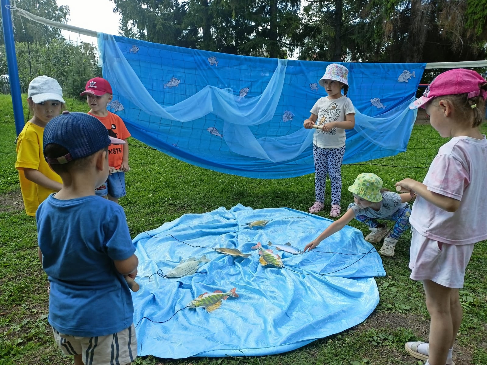 В нашем саду проходит тематическая неделя «Край, в котором мы живем». Сегодня мы отмечали наш традиционный праздник «День рыбака». В гости к ребятам приходил веселый Рыбачок. Он с ребятами отгадывал загадки, помог им вспомнить правила поведения на водоемах. А потом он научил различным хитростям рыбалки. Ребята отлично посоревновались: копали «червей», ходили в поход на рыбалку, ловили рыбу. Понравилось игра на внимание, где ребята различали животных, рыб и птиц. Нашему гостю очень понравилось играть с ребятами. Рыбачок всех поздравил с праздником.