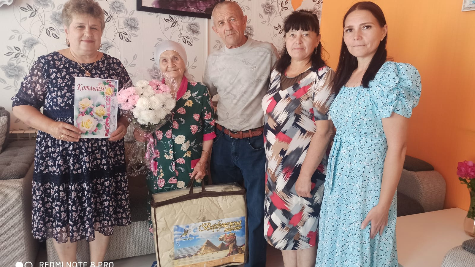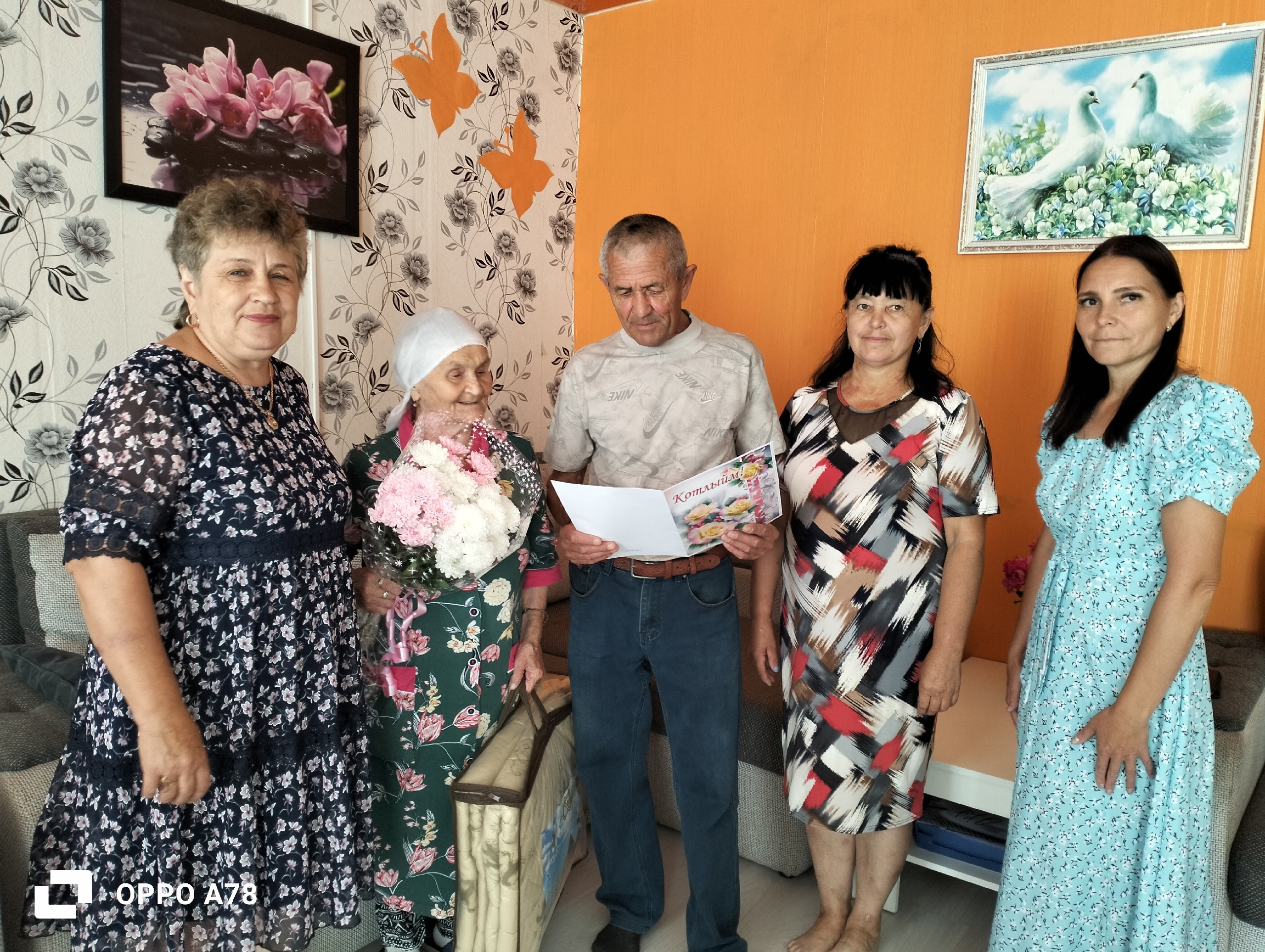 Глава Байрашевского сельского поселения А. М. Губеев , культработники, секретарь СП от имени главы Тетюшского муниципального района Р.Х. Сафиуллова поздравили жительницу села Хикматову Султанию Хуснулловну с 90-летним юбилеем, вручив подарок и пожелав крепкого здоровья.