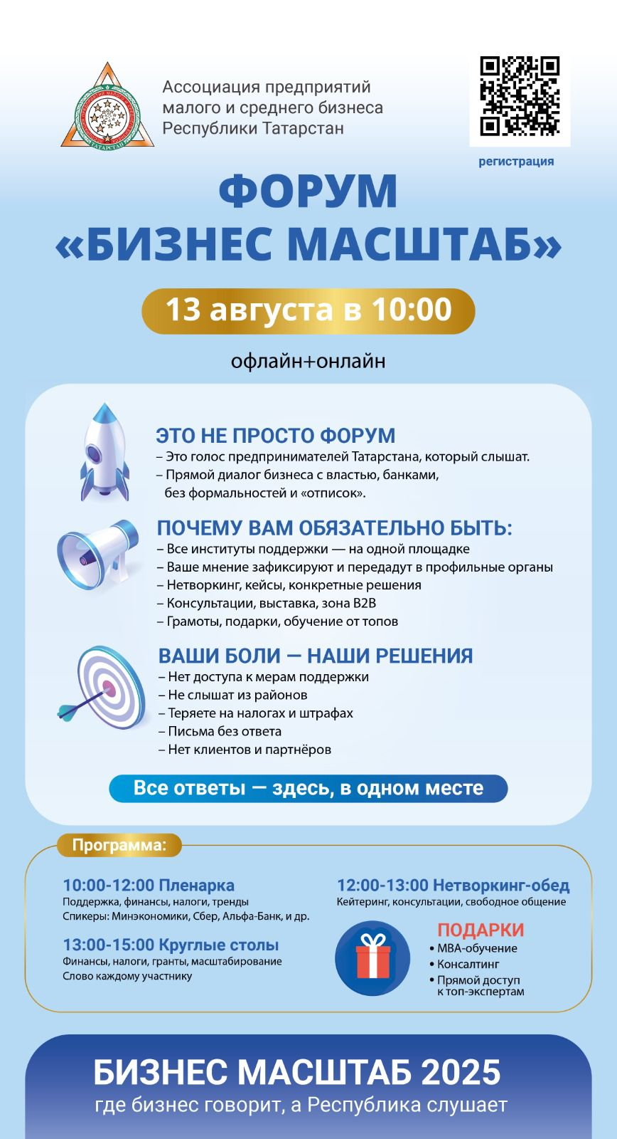 «БИЗНЕС МАСШТАБ. ФИНАНСОВАЯ ЭКОСИСТЕМА БИЗНЕСА и ГОЛОС ПРЕДПРИНИМАТЕЛЕЙ», которая состоится 13 августа 2025 г. с 10:00 до 16:00, в г. Казань, ул. Петербургская, д. 28.