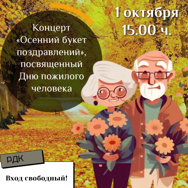 1 октября в 15.00 ч. в Тетюшском районном Доме культуры для жителей и гостей города пройдет концерт «Осенний букет поздравлений», посвященный Дню пожилого человека. В программе праздничной встречи прозвучат песни, инструментальные композиции, танцевальные номера. Вход свободный! Справки по телефону: 25758. Категория 0+