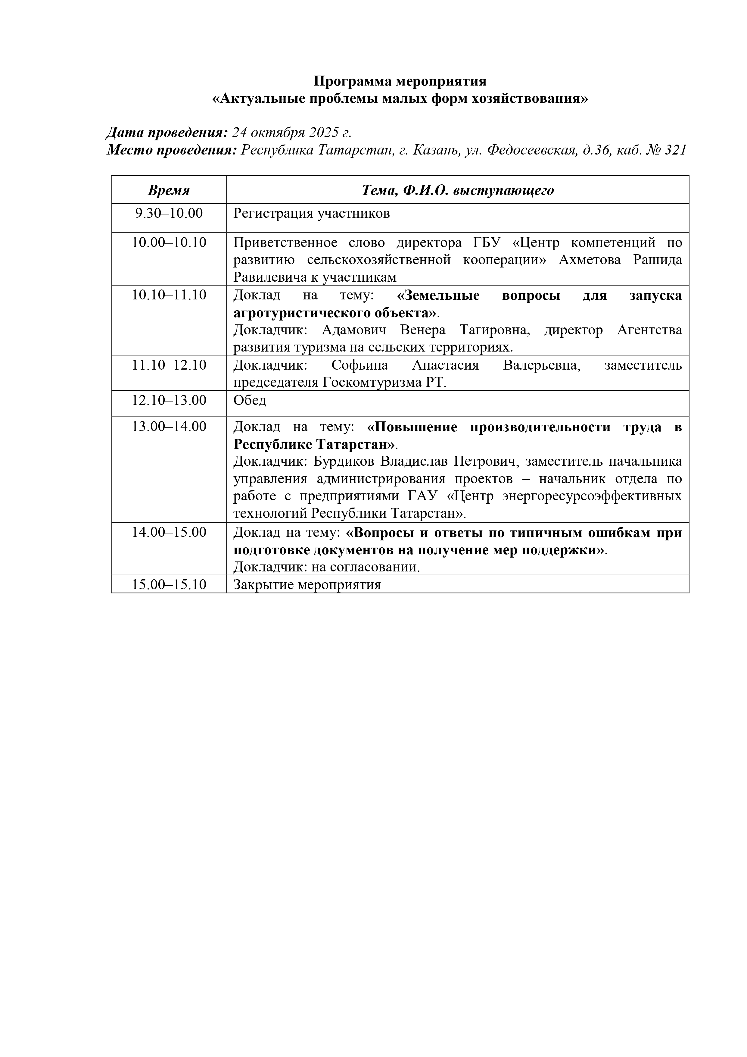 В рамках Семинара будут освещены земельные вопросы для запуска агротуристического объекта, а также вопросы повышения производительности труда в Республике Татарстан. Программа проведения Семинара прилагается к письму.