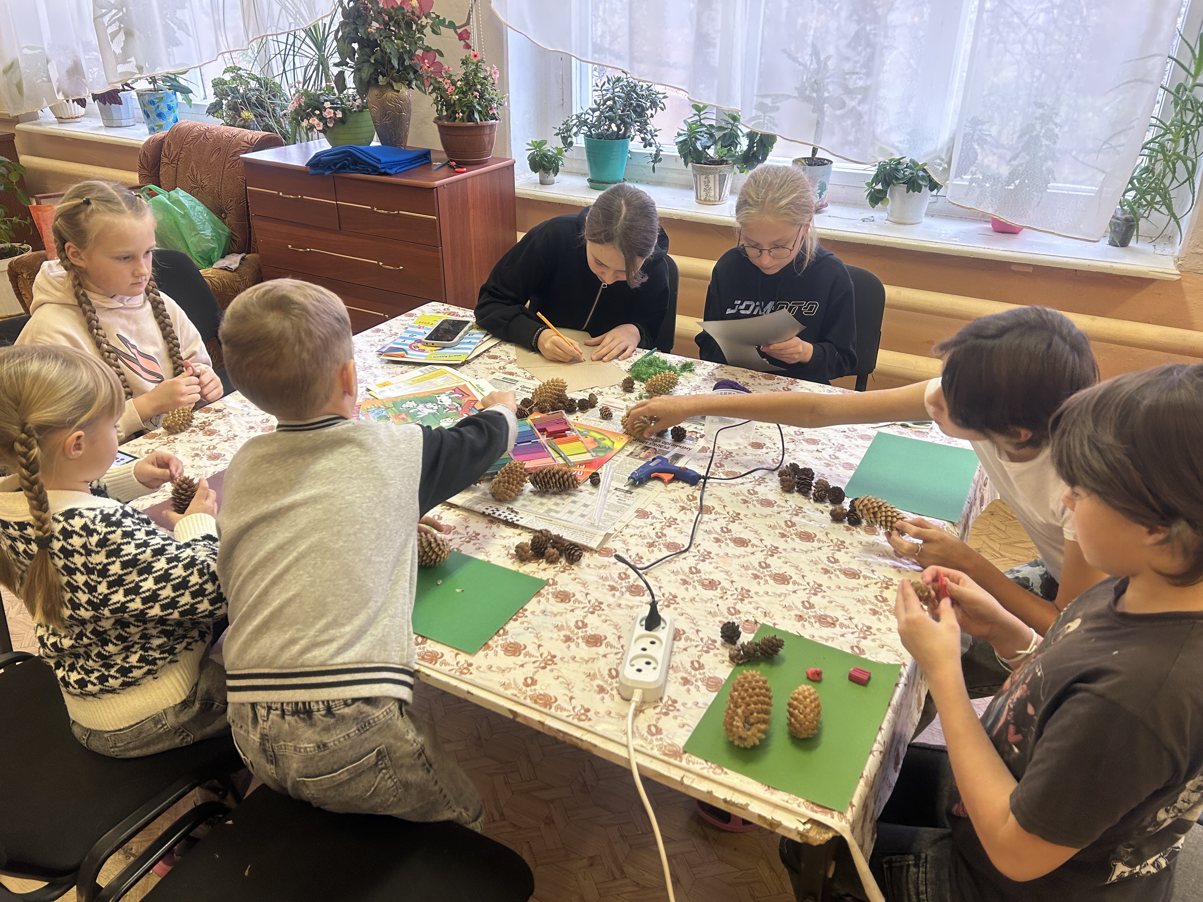 Ребята из творческого клуба «Самоделкин» делали поделки из природного материала и пластилина. Любая работа по изготовлению поделок из природного материала не только увлекательна, но и познавательна. Природный материал – кладовая для развития фантазии, творчества, воображения. Из предложенного материала ребята делали поделки из шишек и дополняли различными элементами. Ребята справились с задачей быстро и легко.