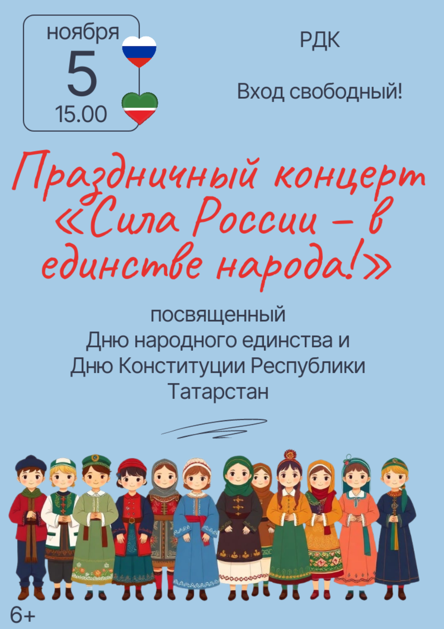 5 ноября в 15.00 ч. в Тетюшском районном Доме культуры состоится состоится праздничный концерт «Сила России – в единстве народа!», посвященный Дню народного единства и Дню Конституции Республики Татарстан.