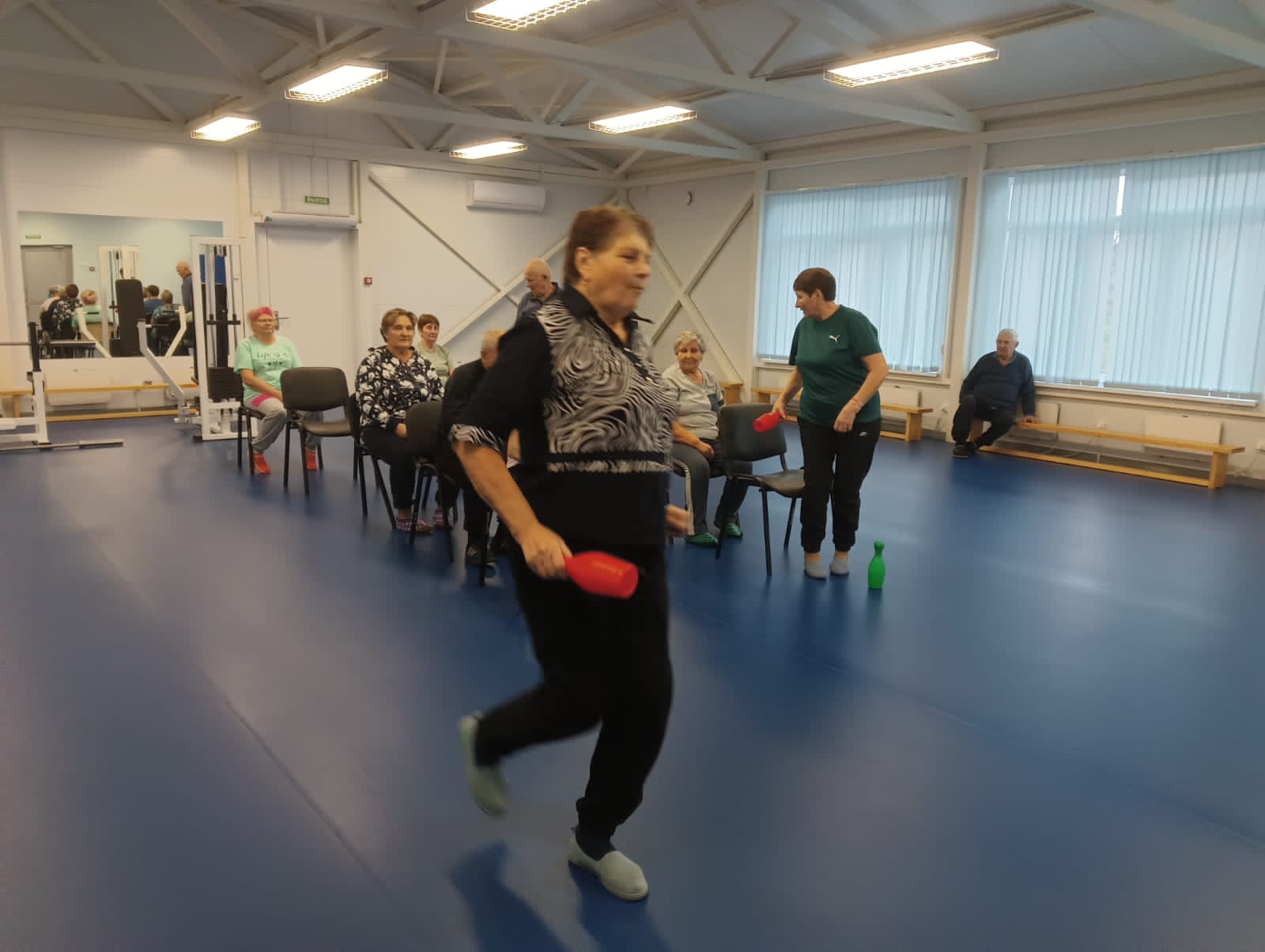 Затем были проведены занятия на растяжку сидя на стульях, лёжа на матах, с гимнастической палкой ...